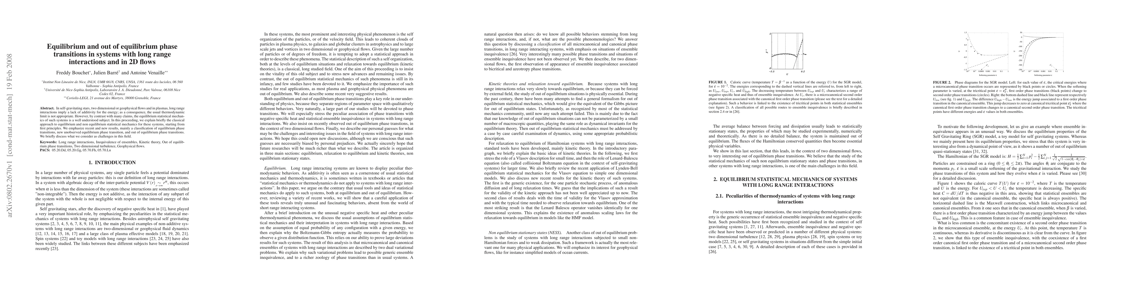 This paper discusses the equilibrium and out of equilibrium phase transitions in systems with long-range interactions, such as self-gravitating stars and plasmas. It highlights the classical approach to statistical mechanics for these systems, emphasizing recent findings including a classification of equilibrium phase transitions and an unobserved equilibrium phase transition, along with out of equilibrium transitions.