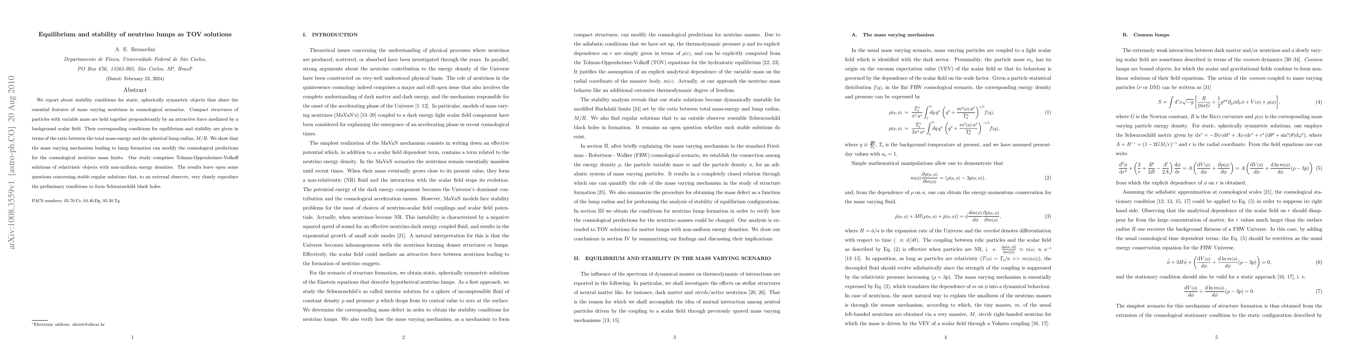 This paper investigates the equilibrium and stability of static, spherically symmetric neutrino lumps, modeled by Tolman-Oppenheimer-Volkoff solutions, which are held together by a scalar field. The study finds that mass-varying mechanisms can alter cosmological predictions for neutrino mass limits, raising questions about stable, regular solutions resembling Schwarzschild black holes.