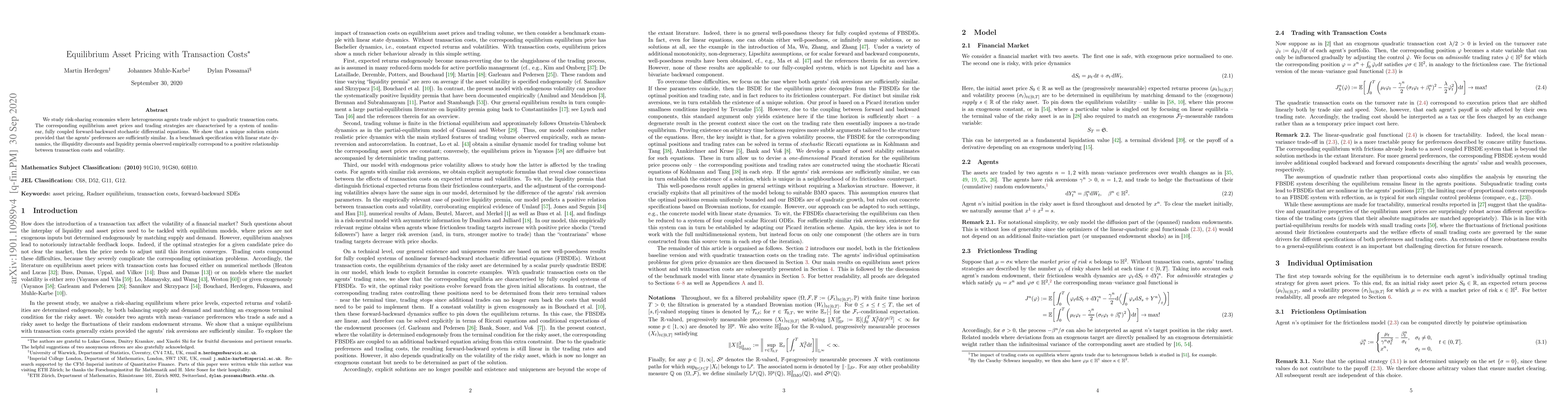 We study risk-sharing economies where heterogenous agents trade subject to quadratic transaction costs. The corresponding equilibrium asset prices and trading strategies are characterised by a system of nonlinear, fully-coupled forward-backward stochastic differential equations. We show that a unique solution generally exists provided that the agents' preferences are sufficiently similar. In a benchmark specification with linear state dynamics, the illiquidity discounts and liquidity premia observed empirically correspond to a positive relationship between transaction costs and volatility.