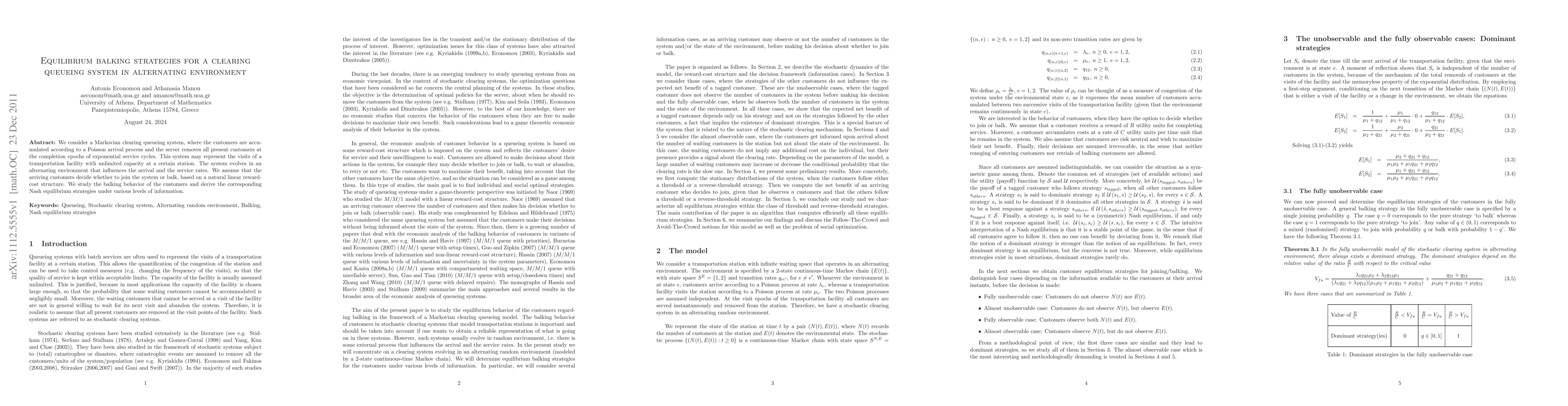 This paper examines a Markovian clearing queueing system with Poisson arrivals and exponential service cycles, operating in an alternating environment affecting rates. It analyzes customer balking strategies based on a linear reward-cost structure and derives the Nash equilibrium strategies for different information levels.