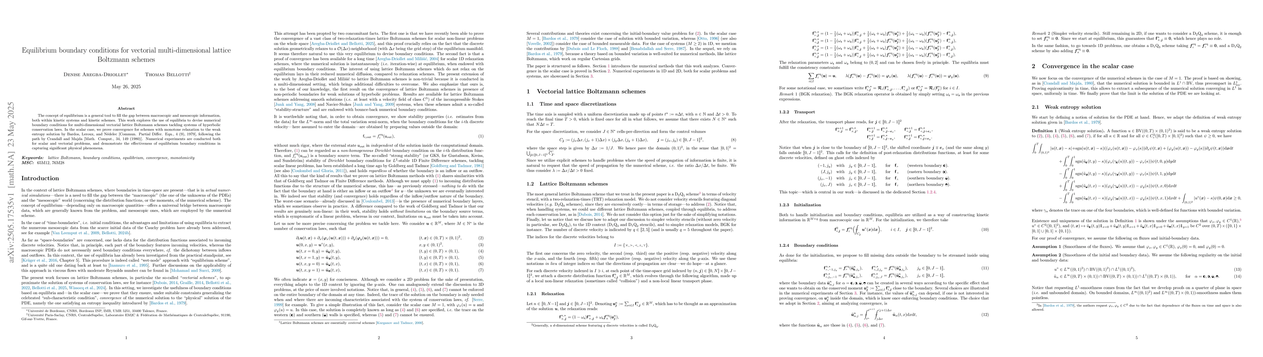 The development of equilibrium boundary conditions for vectorial multi-dimensional lattice Boltzmann schemes and their convergence proof for scalar problems.