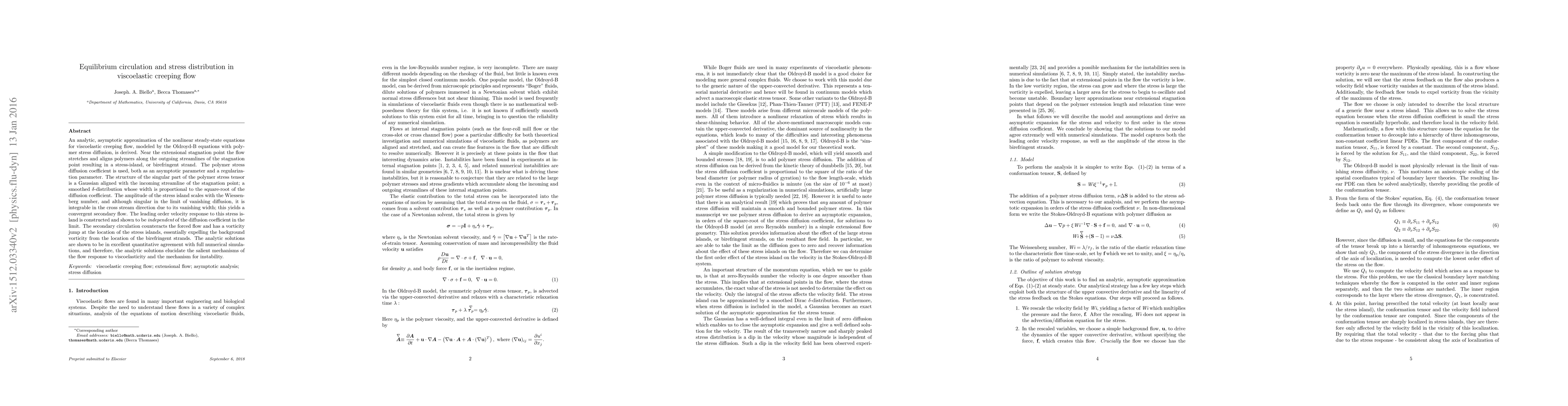 An analytic, asymptotic approximation of the nonlinear steady-state equations for viscoelastic creeping flow, modeled by the Oldroyd-B equations with polymer stress diffusion, is derived. Near the extensional stagnation point the flow stretches and aligns polymers along the outgoing streamlines of the stagnation point resulting in a stress-island, or birefringent strand. The polymer stress diffusion coefficient is used, both, as an asymptotic parameter and a regularization parameter. The structure of the singular part of polymer stress tensor is a Gaussian aligned with the incoming streamline of the stagnation point; a smoothed $\delta$-distribution whose width is proportional to the square-root of the diffusion coefficient. The amplitude of the stress island scales with the Wiessenberg number and, although singular in the limit of vanishing diffusion, it is integrable in the cross stream direction due to its vanishing width; this yields a convergent secondary flow. The leading order velocity response to this stress island is constructed and shown to be {\em independent} of the diffusion coefficient in the limit. The secondary circulation counteracts the forced flow and has a vorticity jump at the location of the stress islands, essentially expelling the background vorticity from the location of the birefringent strands. The analytic solutions are shown to be in excellent quantitative agreement with full numerical simulations and, therefore, the analytic solutions elucidate the salient mechanisms of the flow response to viscoelasticity and the mechanism for instability.