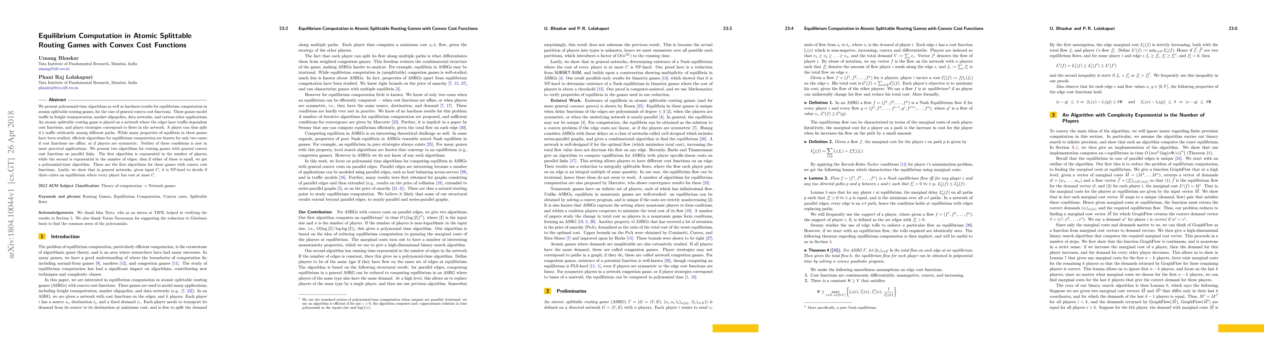 This paper presents polynomial-time algorithms and hardness results for computing equilibria in atomic splittable routing games with general convex cost functions, applicable to freight transportation and data networks. The authors introduce two algorithms, one exponential in players and another in edges, providing the first solutions for convex cost functions in these games.