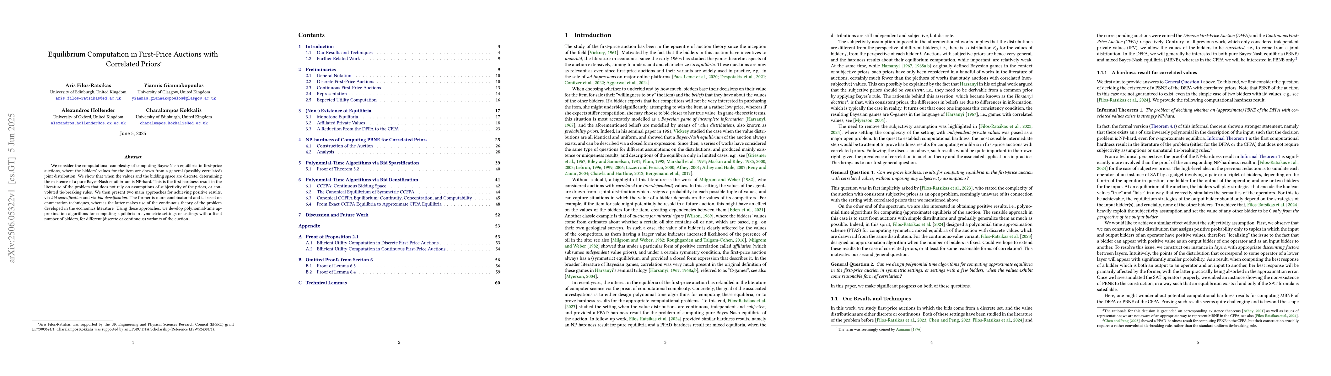 The paper analyzes the computational complexity of computing Bayes-Nash equilibria in first-price auctions with correlated priors, focusing on discrete value and bidding spaces.