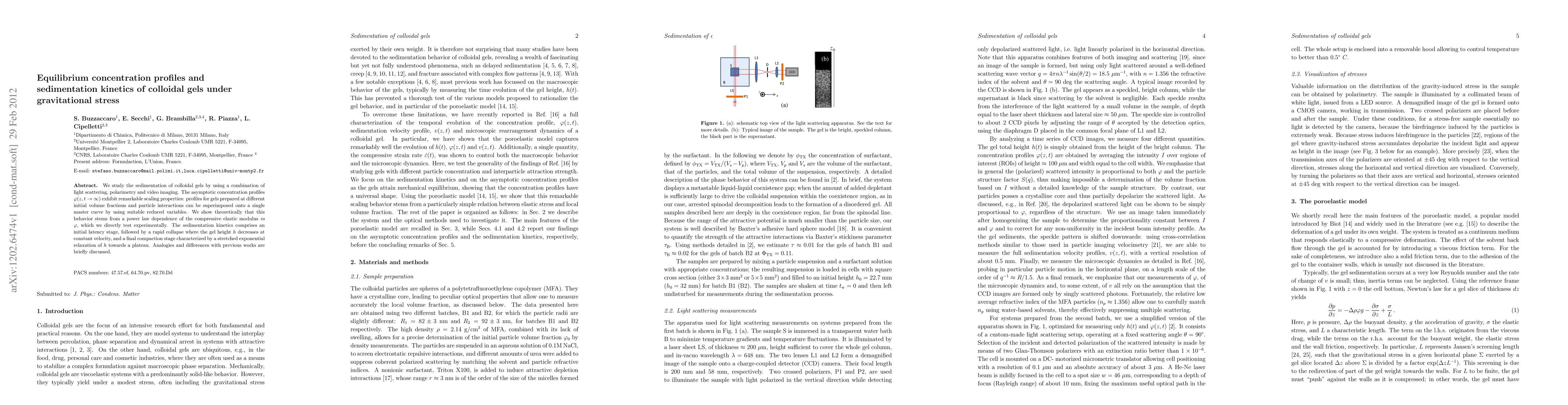 This paper investigates the sedimentation behavior of colloidal gels using light scattering, polarimetry, and video imaging, revealing scaling properties in concentration profiles and a power law relationship between the compressive elastic modulus and concentration. The sedimentation kinetics includes an initial latency, followed by rapid collapse and a final compaction stage with stretched exponential relaxation.