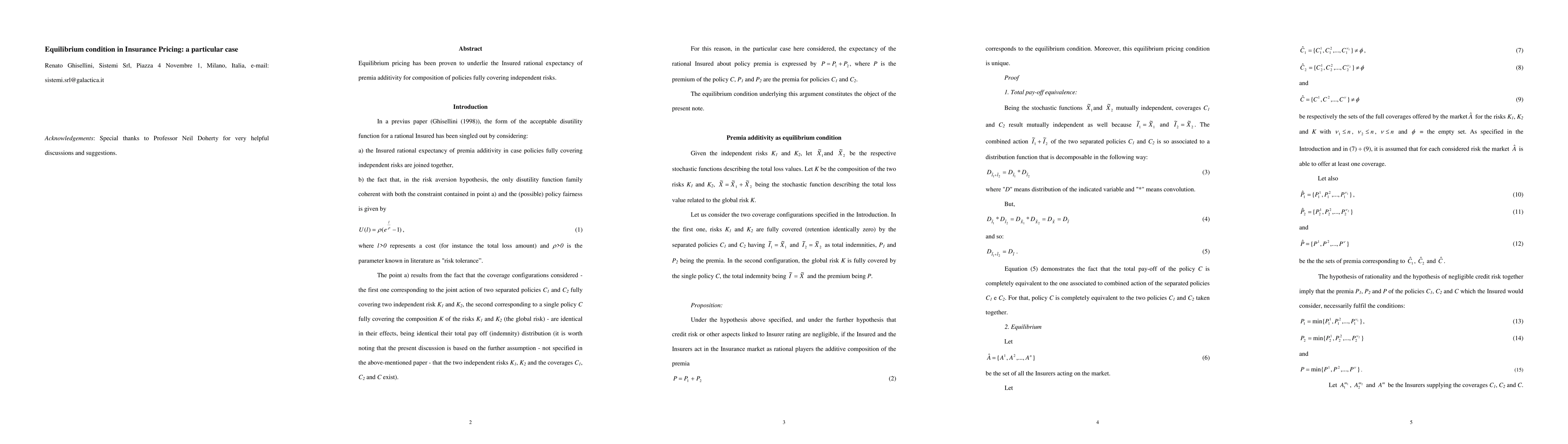 Equilibrium pricing has been proven to underlie the rational Insured expectancy of premia additivity for composition of policies fully covering independent risks.