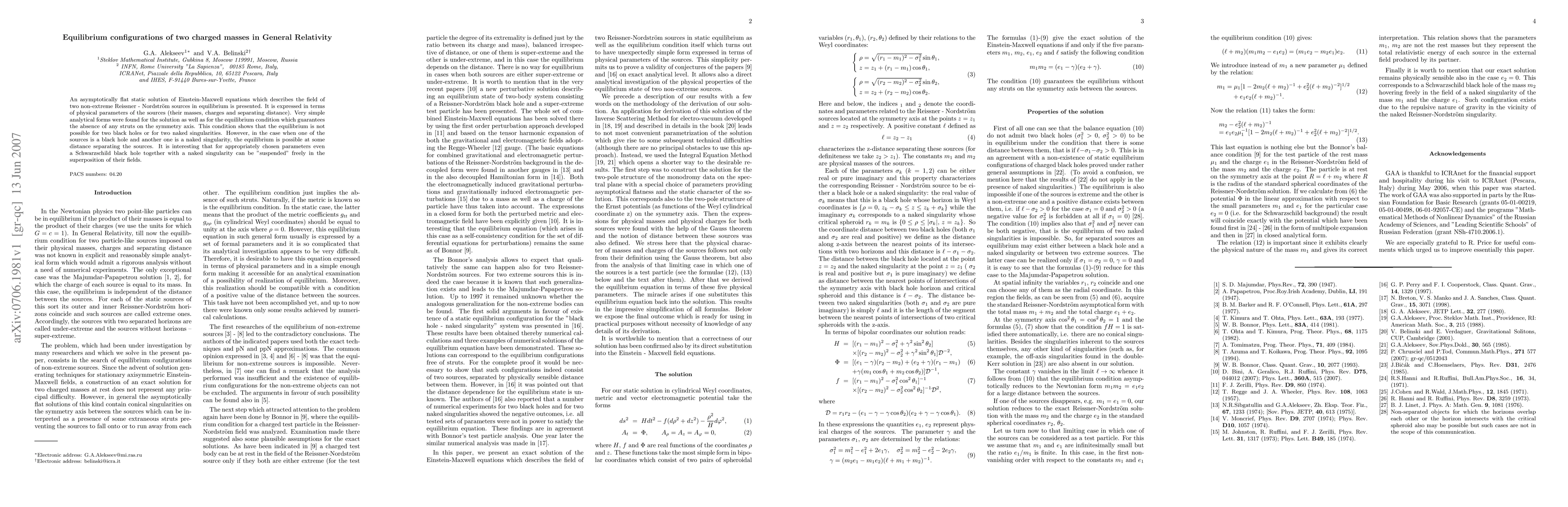 An asymptotically flat static solution of Einstein-Maxwell equations which describes the field of two non-extreme Reissner - Nordstr\"om sources in equilibrium is presented. It is expressed in terms of physical parameters of the sources (their masses, charges and separating distance). Very simple analytical forms were found for the solution as well as for the equilibrium condition which guarantees the absence of any struts on the symmetry axis. This condition shows that the equilibrium is not possible for two black holes or for two naked singularities. However, in the case when one of the sources is a black hole and another one is a naked singularity, the equilibrium is possible at some distance separating the sources. It is interesting that for appropriately chosen parameters even a Schwarzschild black hole together with a naked singularity can be "suspended" freely in the superposition of their fields.