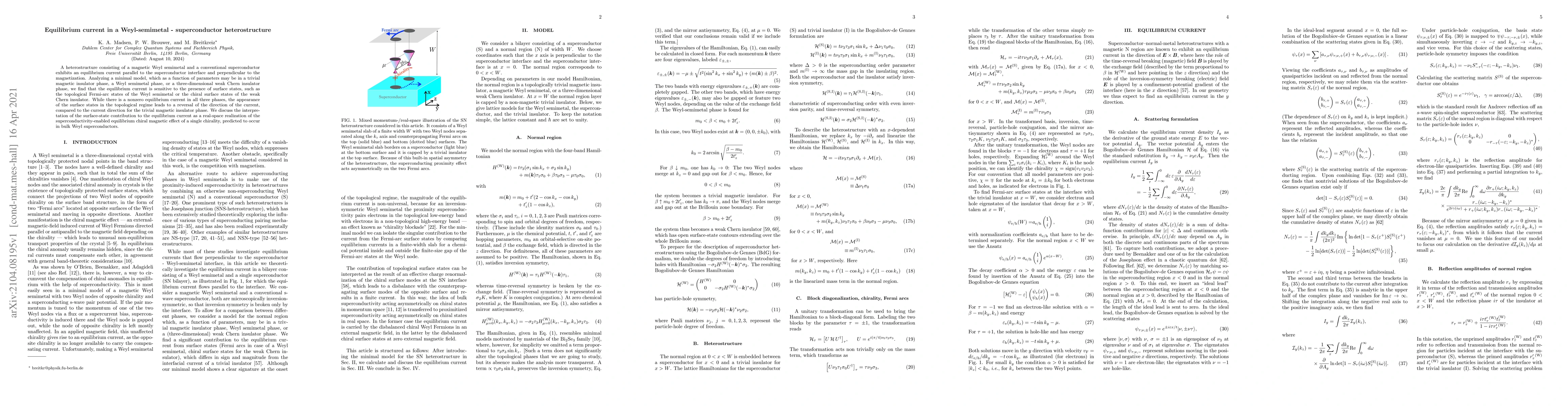 This paper investigates a heterostructure of a Weyl semimetal and a superconductor, finding an equilibrium current influenced by surface states. The current direction reverses in the topological regime due to the presence of topological Fermi-arc states, interpreted as a manifestation of the superconductivity-enabled equilibrium chiral magnetic effect.