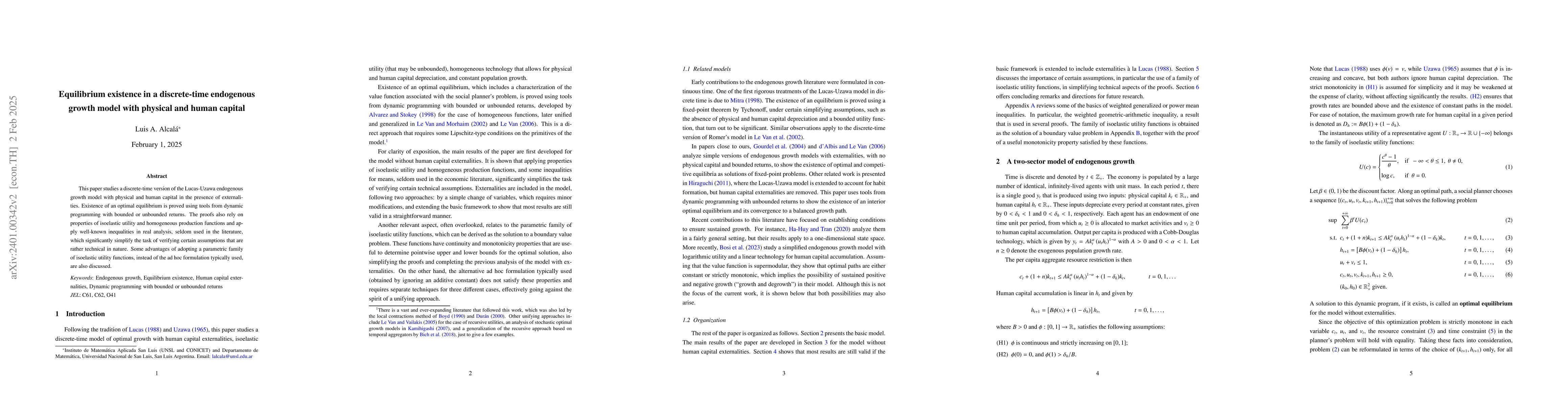 This paper proves the existence of equilibrium in a discrete-time endogenous growth model incorporating both physical and human capital, utilizing dynamic programming and properties of homogeneous functions, alongside lesser-used real analysis inequalities to simplify technical verifications.