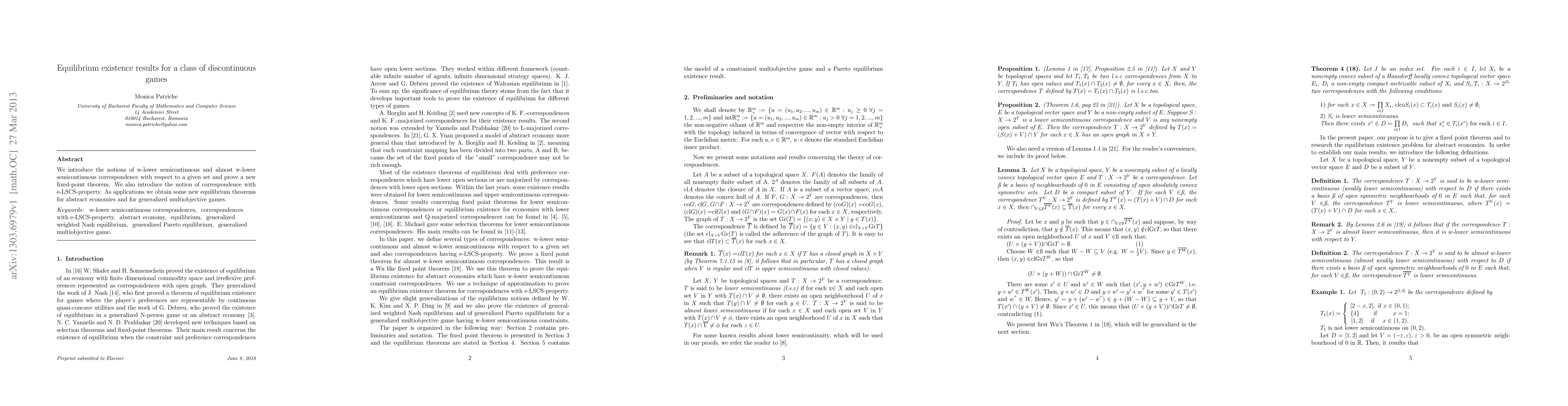 We introduce the notions of w-lower semicontinuous and almost w-lower semicontinuous correspondence with respect to a given set and prove a new fixed-point theorem. We also introduce the notion of correspondence with e-LSCS-property. As applications we obtain some new equilibrium theorems for abstract economies and for generalized multiobjective games.