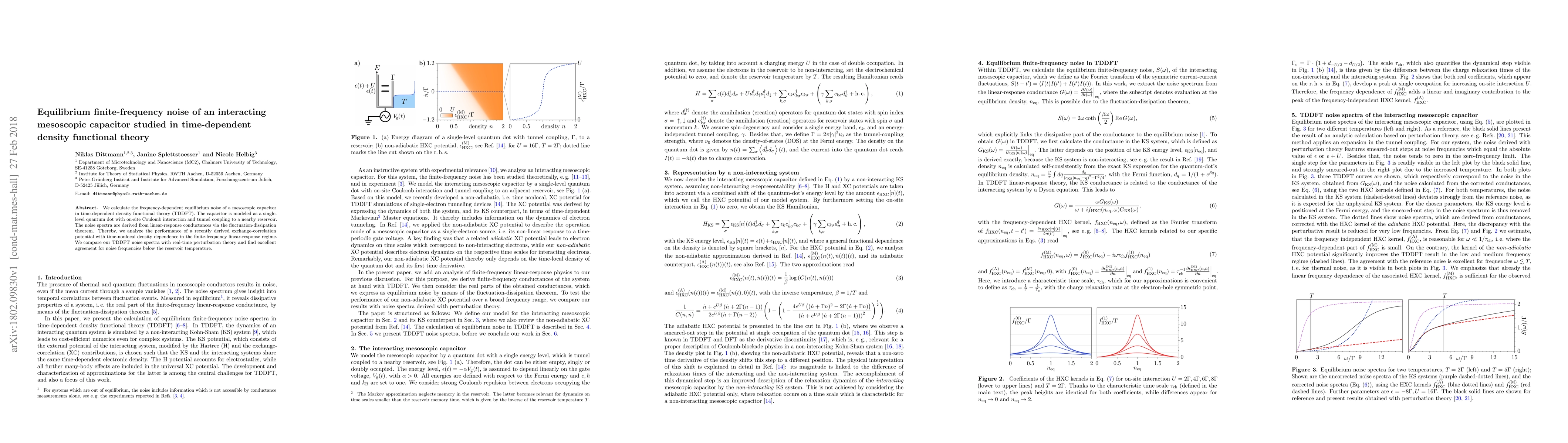 We calculate the frequency-dependent equilibrium noise of a mesoscopic capacitor in time-dependent density functional theory (TDDFT). The capacitor is modeled as a single-level quantum dot with on-site Coulomb interaction and tunnel coupling to a nearby reservoir. The noise spectra are derived from linear-response conductances via the fluctuation-dissipation theorem. Thereby, we analyze the performance of a recently derived exchange-correlation potential with time-nonlocal density dependence in the finite-frequency linear-response regime. We compare our TDDFT noise spectra with real-time perturbation theory and find excellent agreement for noise frequencies below the reservoir temperature.