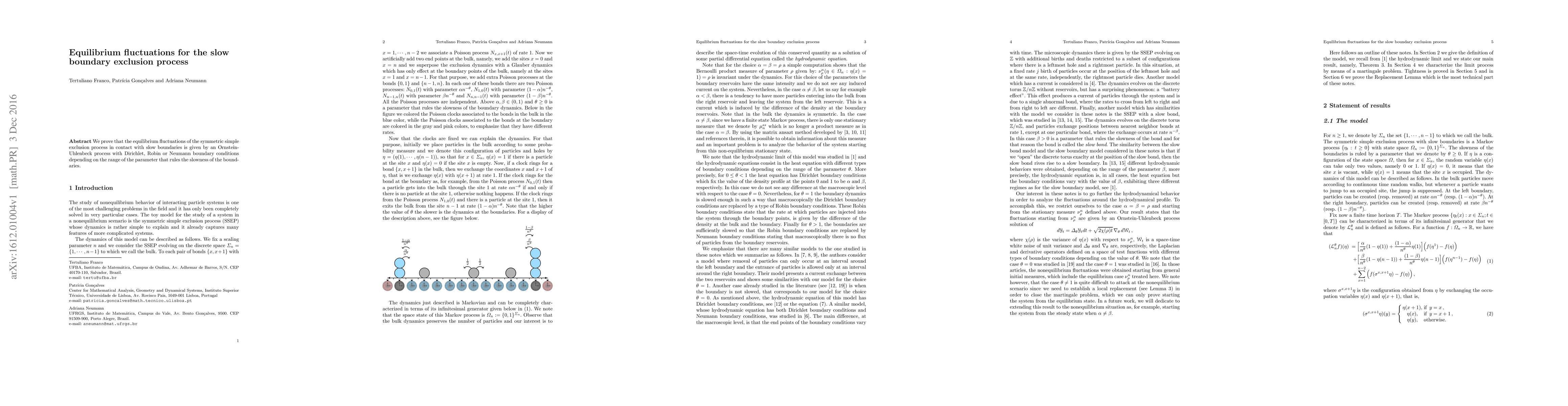 The paper demonstrates that the equilibrium fluctuations of the symmetric simple exclusion process interacting with slow boundaries follow an Ornstein-Uhlenbeck process, with the boundary conditions varying based on the parameter governing the boundary's slowness.