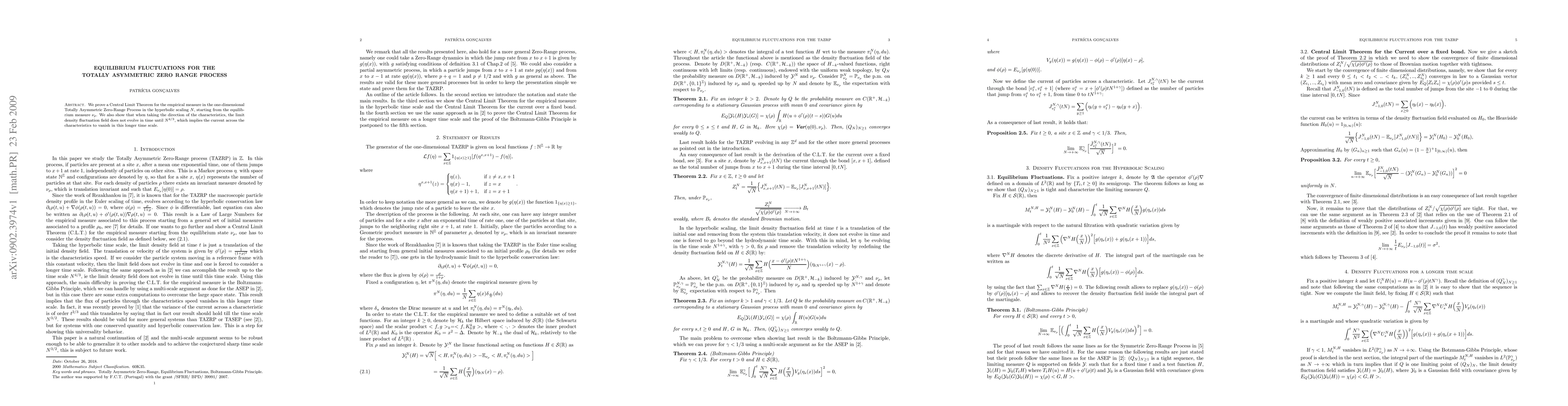 This paper proves a Central Limit Theorem for the empirical measure in the one-dimensional Totally Asymmetric Zero-Range Process under hyperbolic scaling, starting from equilibrium. It also demonstrates that the limit density fluctuation field remains stationary until time $N^{4/3}$, indicating vanishing current across characteristics over this extended time scale.