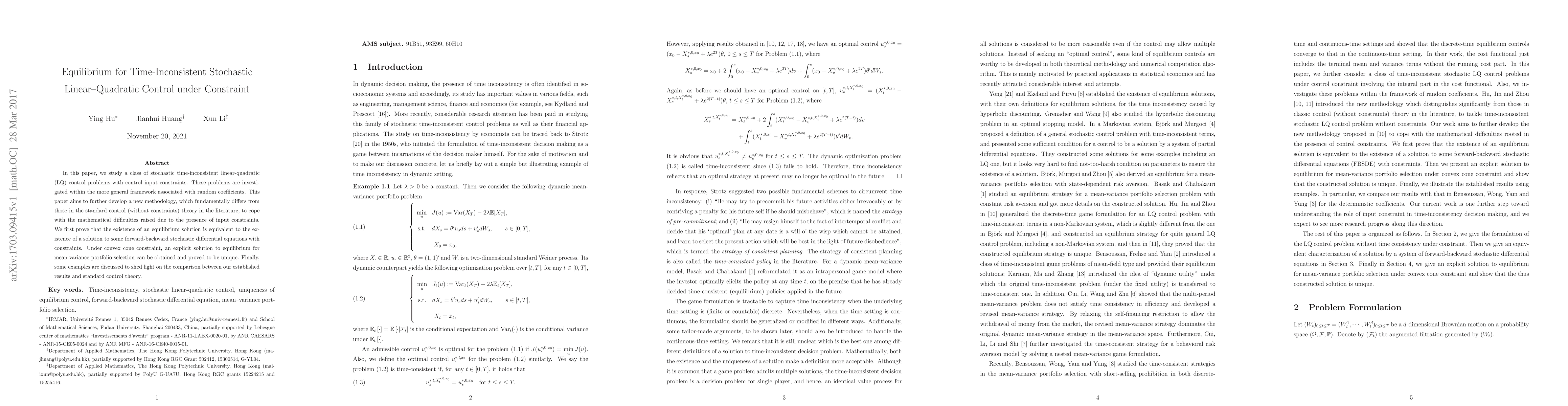 In this paper, we study a class of stochastic time-inconsistent linear-quadratic (LQ) control problems with control input constraints. These problems are investigated within the more general framework associated with random coefficients. This paper aims to further develop a new methodology, which fundamentally differs from those in the standard control (without constraints) theory in the literature, to cope with the mathematical difficulties raised due to the presence of input constraints. We first prove that the existence of an equilibrium solution is equivalent to the existence of a solution to some forward-backward stochastic differential equations with constraints. Under convex cone constraint, an explicit solution to equilibrium for mean-variance portfolio selection can be obtained and proved to be unique. Finally, some examples are discussed to shed light on the comparison between our established results and standard control theory.