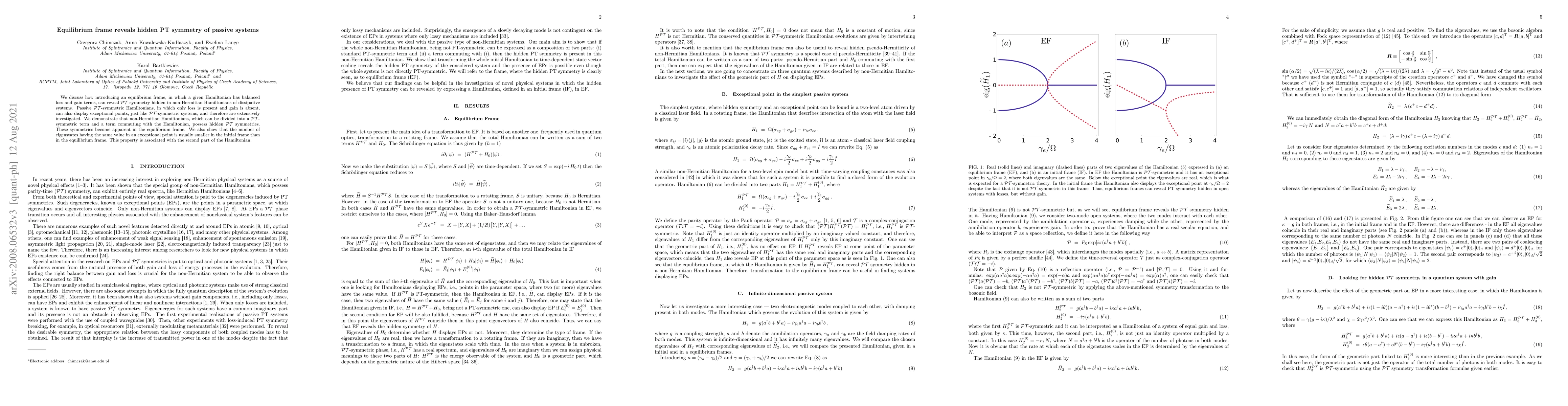 We discuss how introducing an equilibrium frame, in which a given Hamiltonian has balanced loss and gain terms, can reveal PT symmetry hidden in non-Hermitian Hamiltonians of dissipative systems. Passive PT-symmetric Hamiltonians, in which only loss is present and gain is absent, can also display exceptional points, just like PT-symmetric systems, and therefore are extensively investigated. We demonstrate that non-Hermitian Hamiltonians, which can be divided into a PT-symmetric term and a term commuting with the Hamiltonian, possess hidden PT symmetries. These symmetries become apparent in the equilibrium frame. We also show that the number of eigenstates having the same value in an exceptional point is usually smaller in the initial frame than in the equilibrium frame. This property is associated with the second part of the Hamiltonian.