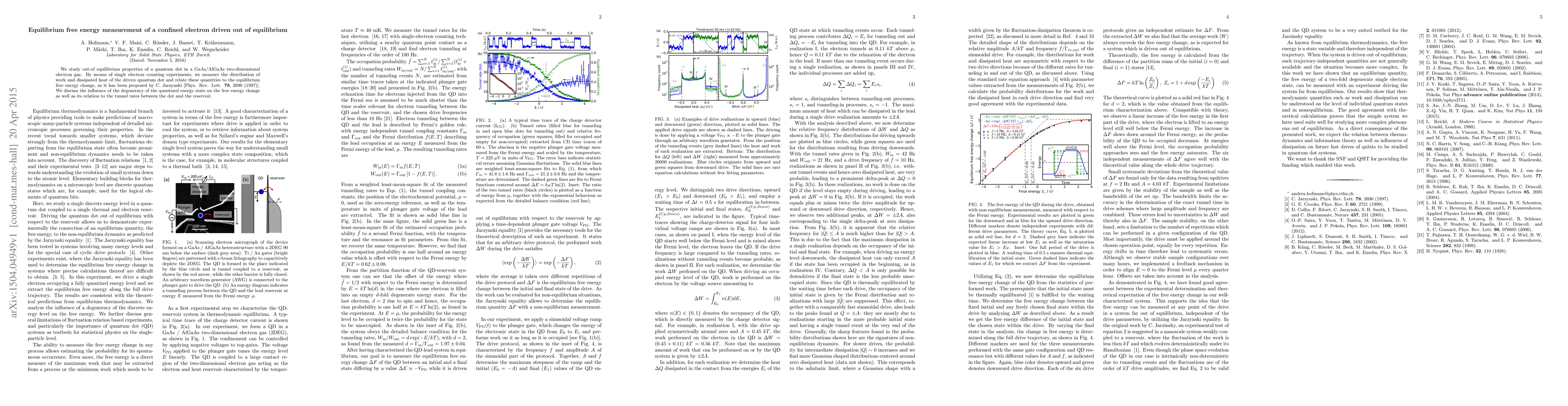 This paper measures the work distribution and dissipated heat in a quantum dot driven out of equilibrium, using single electron counting experiments. It relates these quantities to the equilibrium free energy change, discussing the impact of energy state degeneracy and tunnel rates on the free energy change.