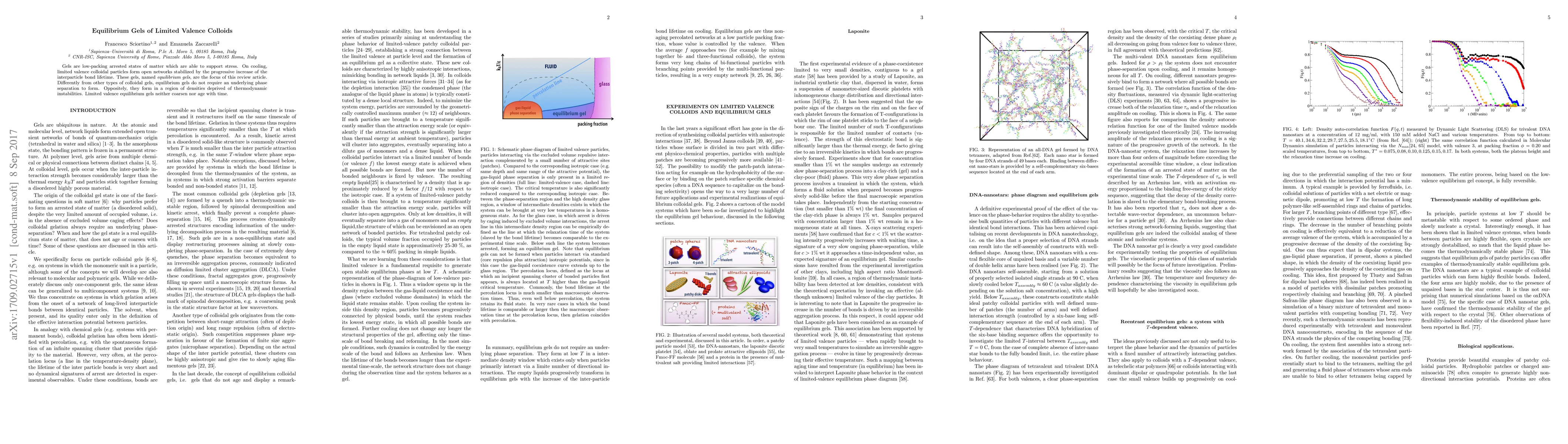 This paper reviews equilibrium gels formed by limited valence colloidal particles, which create stable open networks without phase separation and do not undergo coarsening or aging over time. These unique gels support stress and maintain their structure indefinitely.