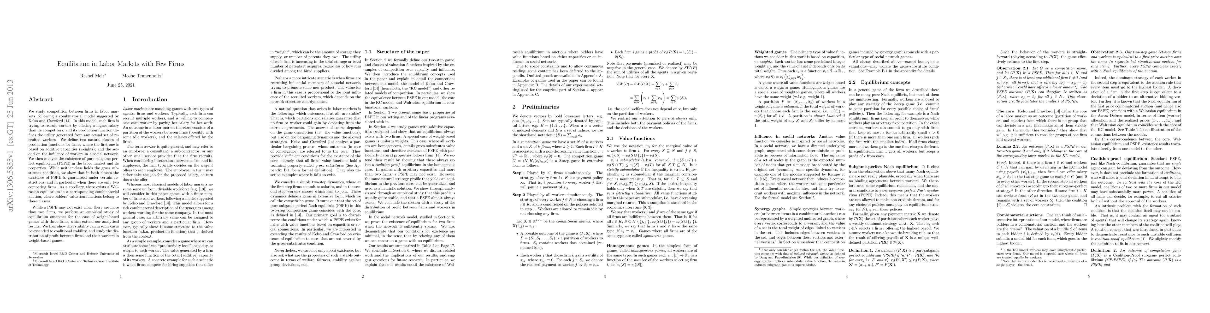 We study competition between firms in labor markets, following a combinatorial model suggested by Kelso and Crawford [1982]. In this model, each firm is trying to recruit workers by offering a higher salary than its competitors, and its production function defines the utility generated from any actual set of recruited workers. We define two natural classes of production functions for firms, where the first one is based on additive capacities (weights), and the second on the influence of workers in a social network. We then analyze the existence of pure subgame perfect equilibrium (PSPE) in the labor market and its properties. While neither class holds the gross substitutes condition, we show that in both classes the existence of PSPE is guaranteed under certain restrictions, and in particular when there are only two competing firms. As a corollary, there exists a Walrasian equilibrium in a corresponding combinatorial auction, where bidders' valuation functions belong to these classes. While a PSPE may not exist when there are more than two firms, we perform an empirical study of equilibrium outcomes for the case of weight-based games with three firms, which extend our analytical results. We then show that stability can in some cases be extended to coalitional stability, and study the distribution of profit between firms and their workers in weight-based games.
