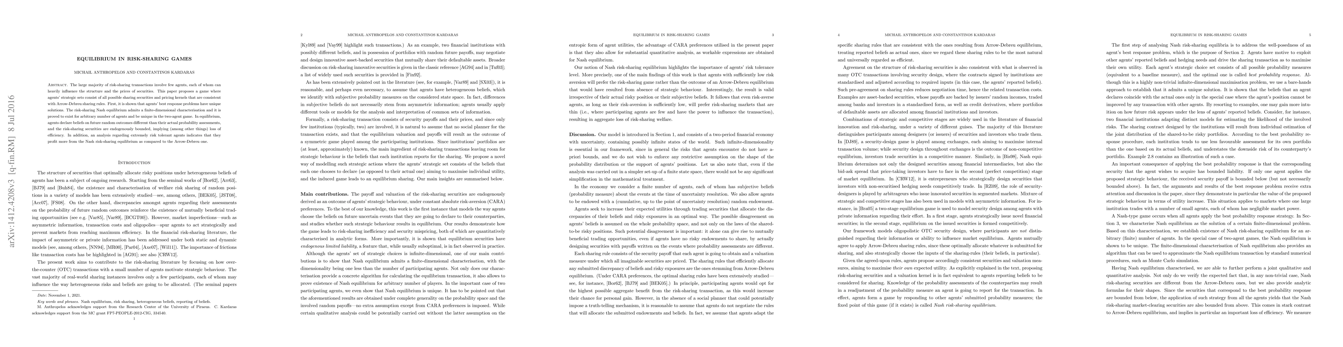 This paper explores a game where agents strategically choose risk-sharing securities and pricing kernels, demonstrating that a unique Nash equilibrium exists for any number of agents, with specific properties in a two-agent scenario. The equilibrium involves agents' beliefs differing from actual probabilities, leading to inefficiencies and benefits for risk-tolerant agents.