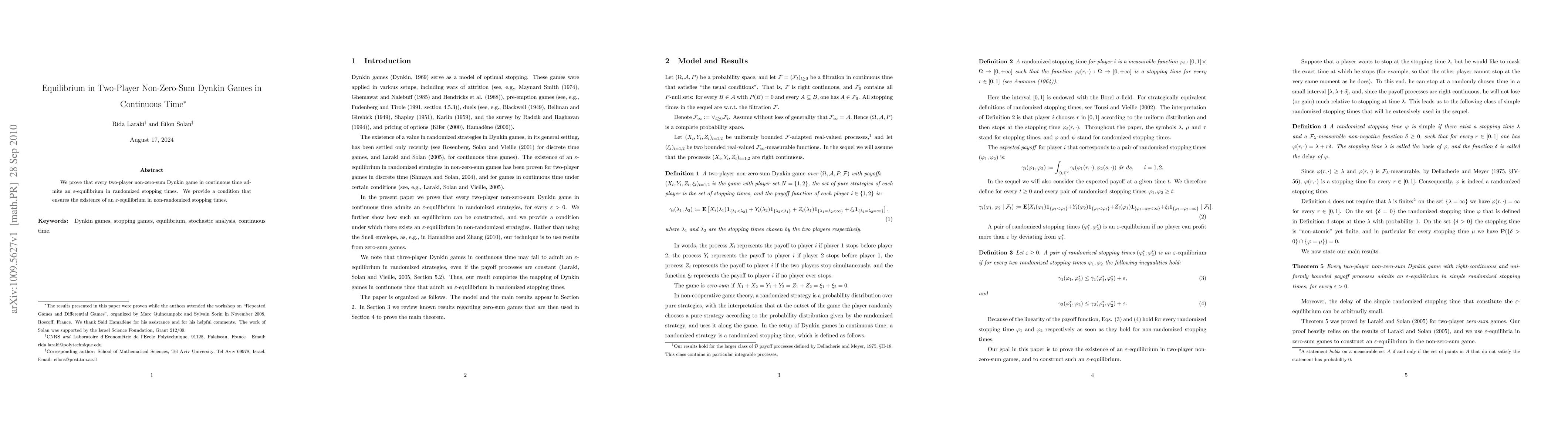 This paper proves the existence of an epsilon-equilibrium in randomized stopping times for two-player non-zero-sum Dynkin games in continuous time. It also establishes a condition that guarantees the existence of an epsilon-equilibrium in non-randomized stopping times.
