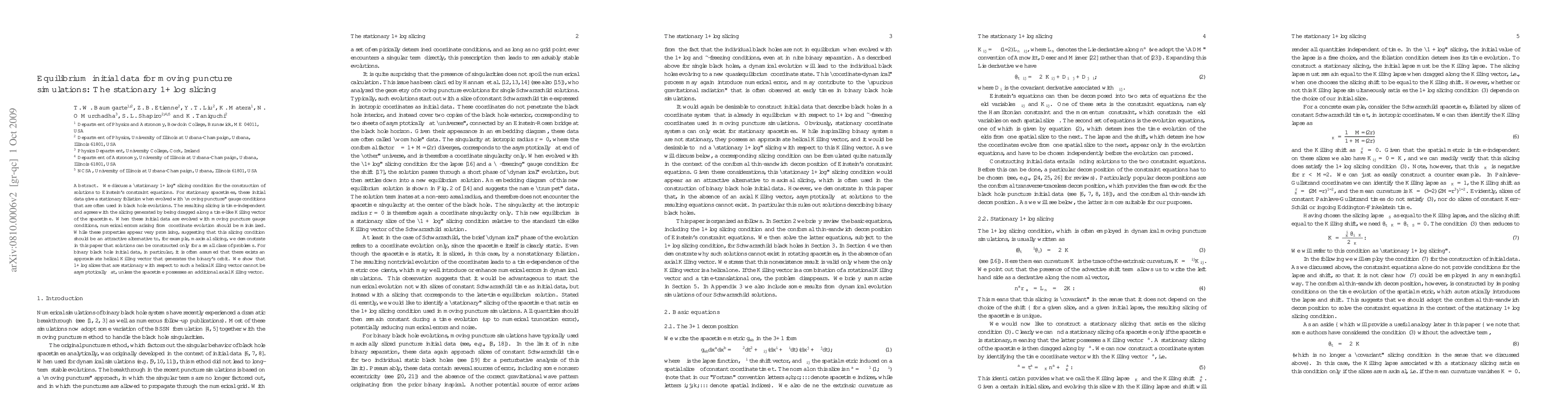This paper explores a "stationary 1+log" slicing condition for constructing initial data solutions to Einstein's constraint equations, which minimizes numerical errors in black hole evolution simulations. It reveals that stationary 1+log slices cannot be asymptotically flat without an additional axial Killing vector.