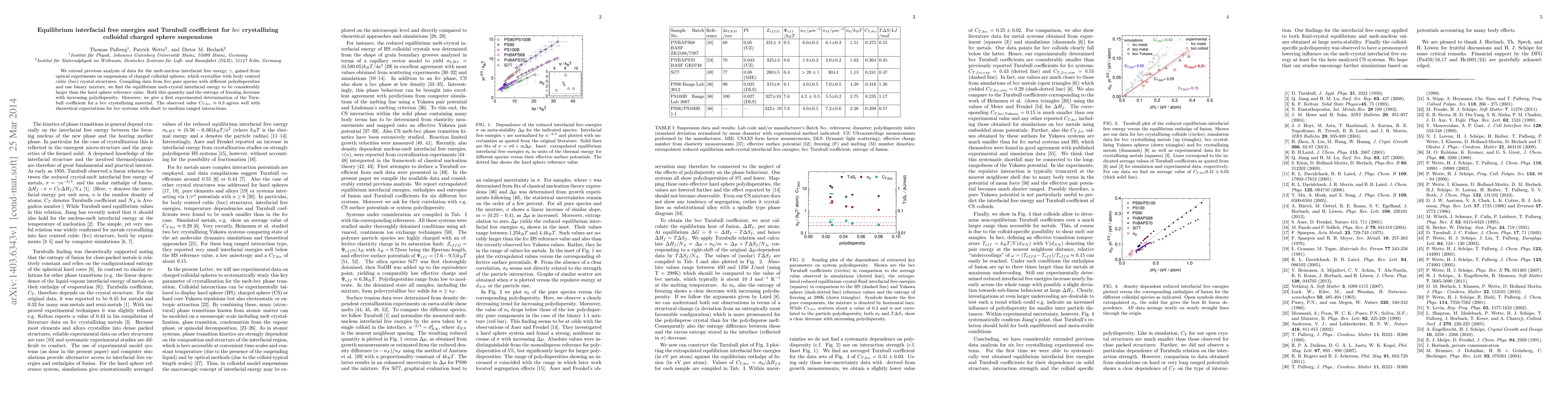 This study investigates the equilibrium interfacial free energy and Turnbull coefficient for bcc crystallizing colloidal charged sphere suspensions, finding that the interfacial energy is higher than for hard spheres and decreases with polydispersity. The Turnbull coefficient for bcc systems is experimentally determined to be approximately 0.3, aligning with theoretical predictions.