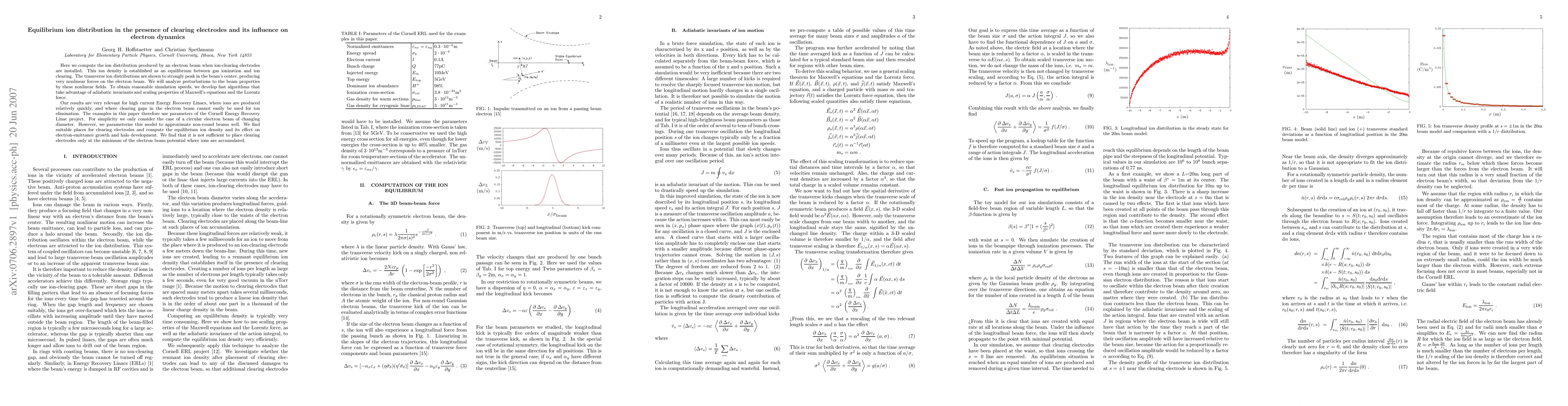 This paper investigates the equilibrium ion distribution created by an electron beam in the presence of ion-clearing electrodes, showing that the ion density peaks strongly in the beam's center, leading to nonlinear forces on the electron beam. The study develops fast algorithms for simulations and finds that clearing electrodes must be strategically placed beyond just the ion accumulation minimum to effectively manage electron-emittance growth and halo development.