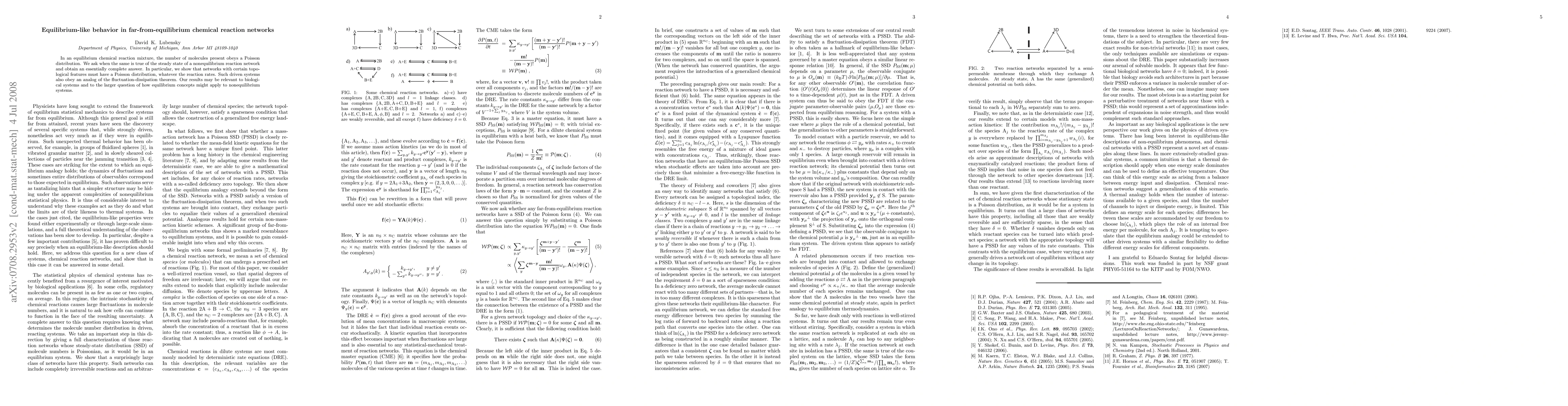 This research paper explores equilibrium-like behavior in nonequilibrium chemical reaction networks, finding that certain topological features lead to Poisson distributions, relevant to biological systems and the broader concept of applying equilibrium concepts to non-equilibrium systems.