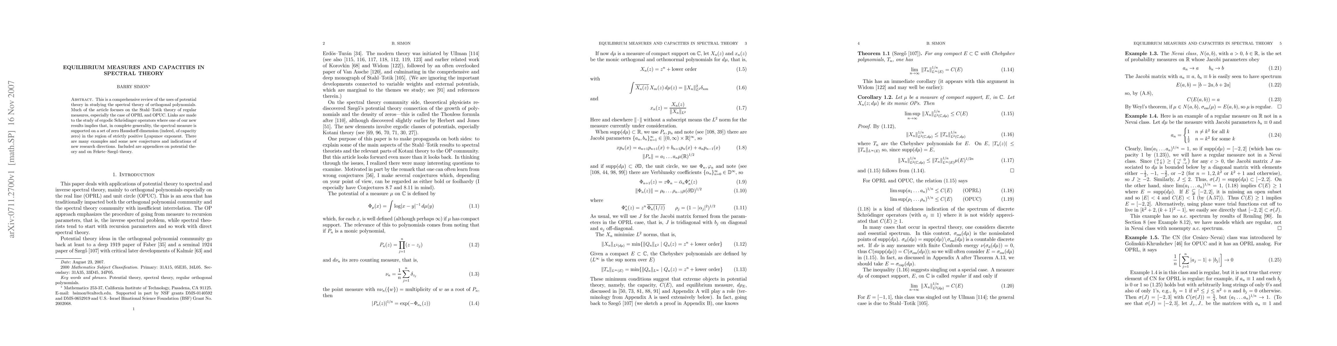 This paper reviews the application of potential theory to spectral theory, focusing on the Stahl-Totik theory of regular measures for orthogonal polynomials. It presents new results linking spectral measures to ergodic Schrödinger operators, showing that the spectral measure has zero capacity in regions of positive Lyapunov exponent.