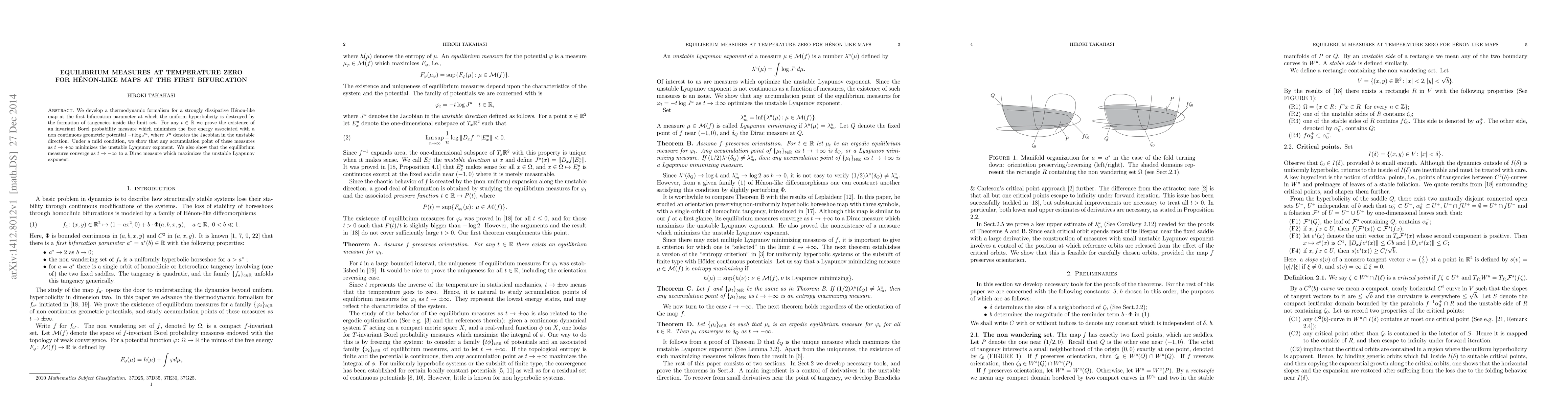 This paper develops a thermodynamic formalism for a strongly dissipative Hénon-like map at its first bifurcation, proving the existence of invariant equilibrium measures that minimize the free energy associated with a non-continuous geometric potential. It also shows that these measures converge to a Dirac measure maximizing the unstable Lyapunov exponent as $t\to-\infty$.