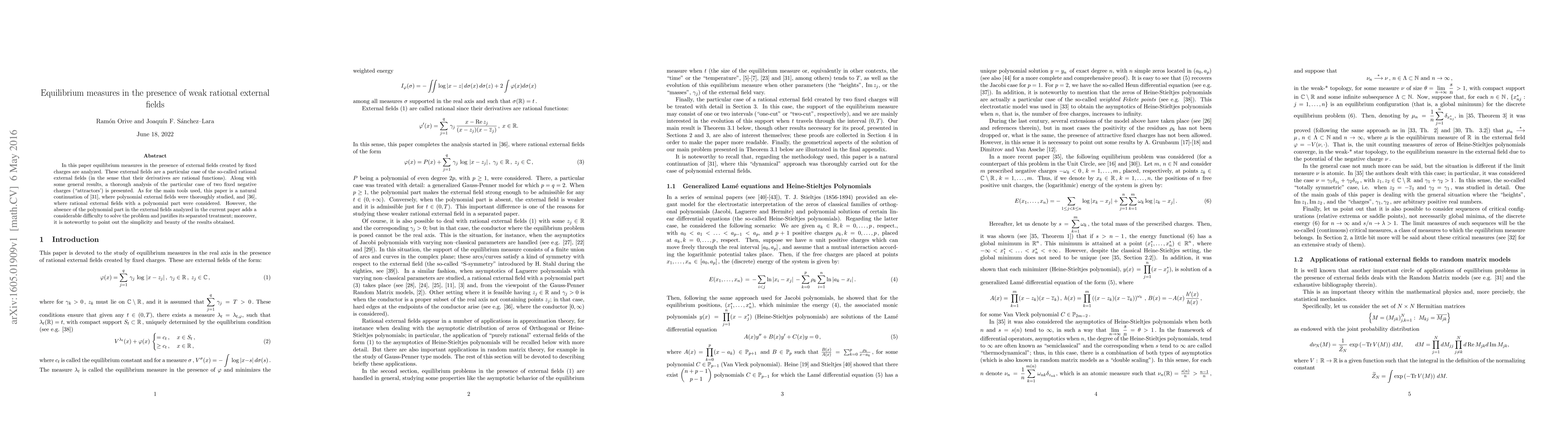 This paper analyzes equilibrium measures influenced by weak rational external fields, specifically focusing on fields generated by fixed charges. It presents a detailed study of the case with two fixed negative charges, highlighting the simplicity and elegance of the results despite the added complexity from the absence of polynomial components in the fields.