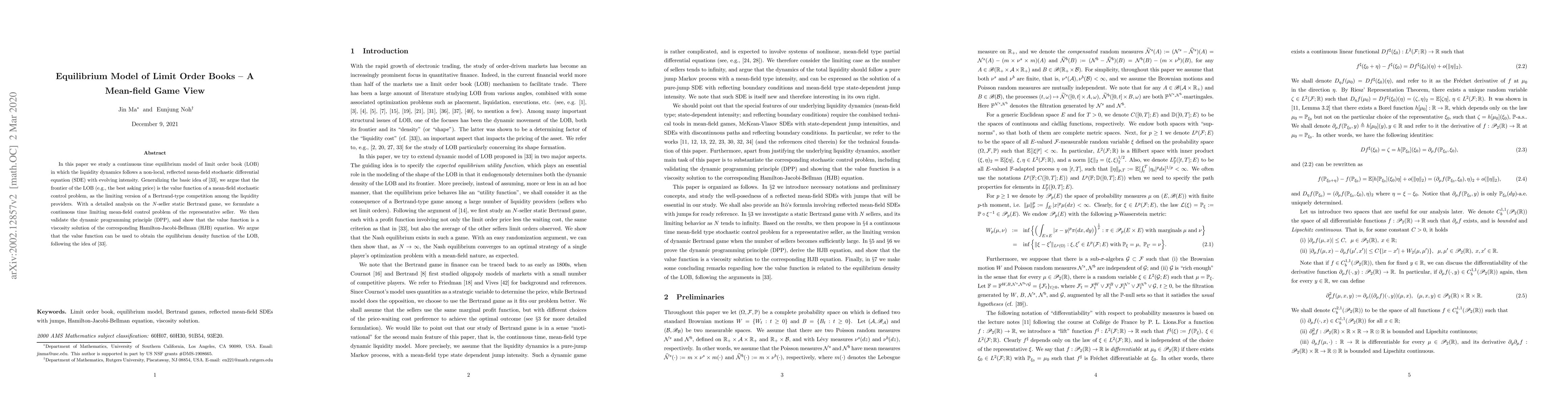 In this paper we study a continuous time equilibrium model of limit order book (LOB) in which the liquidity dynamics follows a non-local, reflected mean-field stochastic differential equation (SDE) with evolving intensity. Generalizing the basic idea of Ma et al. (2015), we argue that the frontier of the LOB (e.g., the best asking price) is the value function of a mean-field stochastic control problem, as the limiting version of a Bertrand-type competition among the liquidity providers. With a detailed analysis on the $N$-seller static Bertrand game, we formulate a continuous time limiting mean-field control problem of the representative seller. We then validate the dynamic programming principle (DPP), and show that the value function is a viscosity solution of the corresponding Hamilton-Jacobi-Bellman (HJB) equation. We argue that the value function can be used to obtain the equilibrium density function of the LOB, following the idea of Ma et al. (2015).