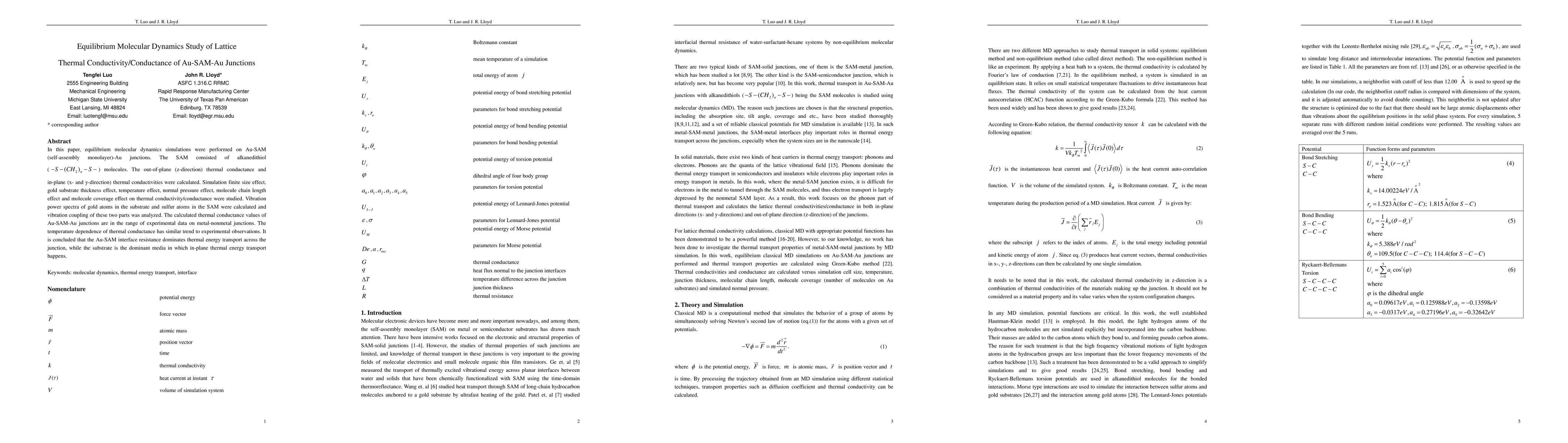 This study uses equilibrium molecular dynamics simulations to analyze the thermal conductivity of Au-SAM-Au junctions, finding that the Au-SAM interface resistance significantly impacts thermal energy transport, while the gold substrate primarily facilitates in-plane thermal conductivity. The calculated thermal conductance aligns with experimental data for metal-nonmetal junctions.