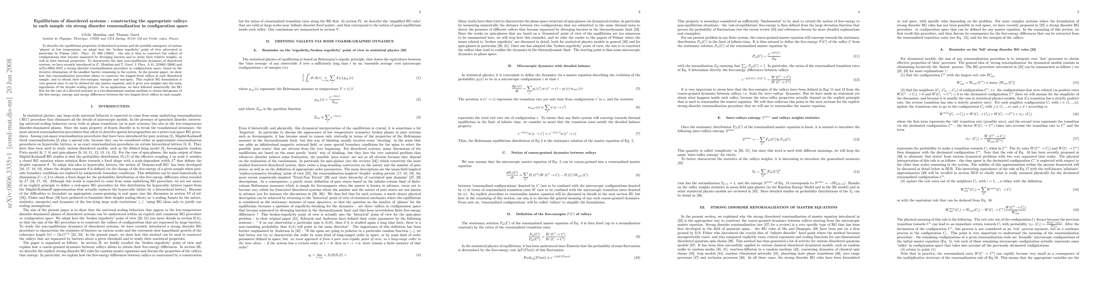 This paper explores the equilibrium properties of disordered systems using a strong disorder renormalization procedure in configuration space. It constructs the longest-lived valleys in each sample, obtaining their free-energies, energies, and entropies, and applies this method to directed polymers in random media to analyze their statistical properties.