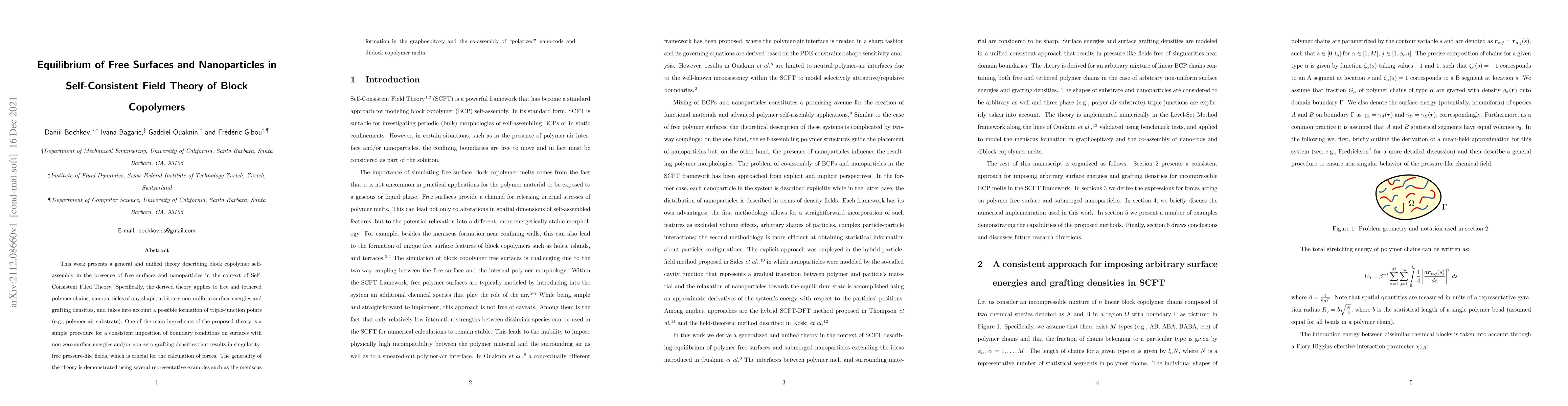 This work presents a general and unified theory describing block copolymer self-assembly in the presence of free surfaces and nanoparticles in the context of Self-Consistent Filed Theory. Specifically, the derived theory applies to free and tethered polymer chains, nanoparticles of any shape, arbitrary non-uniform surface energies and grafting densities, and takes into account a possible formation of triple-junction points (e.g., polymer-air-substrate). One of the main ingredients of the proposed theory is a simple procedure for a consistent imposition of boundary conditions on surfaces with non-zero surface energies and/or non-zero grafting densities that results in singularity-free pressure-like fields, which is crucial for the calculation of forces. The generality of the theory is demonstrated using several representative examples such as the meniscus formation in the graphoepitaxy and the co-assembly of "polarized" nano-rods and diblock copolymer melts.