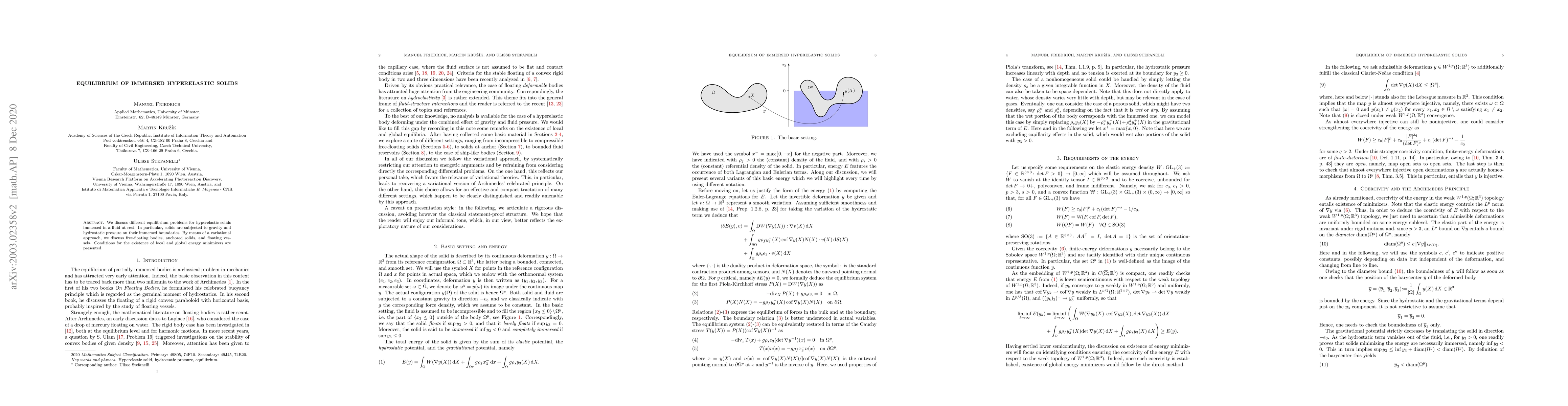 We discuss different equilibrium problems for hyperelastic solids immersed in a fluid at rest. In particular, solids are subjected to gravity and hydrostatic pressure on their immersed boundaries. By means of a variational approach, we discuss free-floating bodies, anchored solids, and floating vessels. Conditions for the existence of local and global energy minimizers are presented.