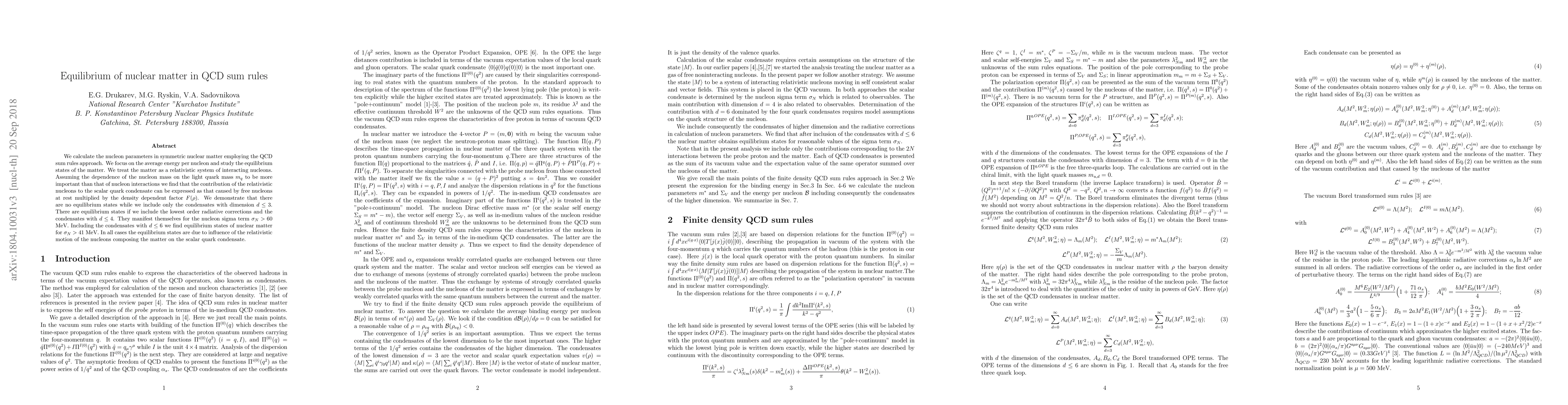 This paper uses QCD sum rules to determine nucleon parameters in symmetric nuclear matter, finding no equilibrium states without including higher-order radiative corrections and condensates with dimension $d \leq 4$. Equilibrium states emerge for nucleon sigma terms above certain thresholds, driven by the relativistic motion of nucleons.