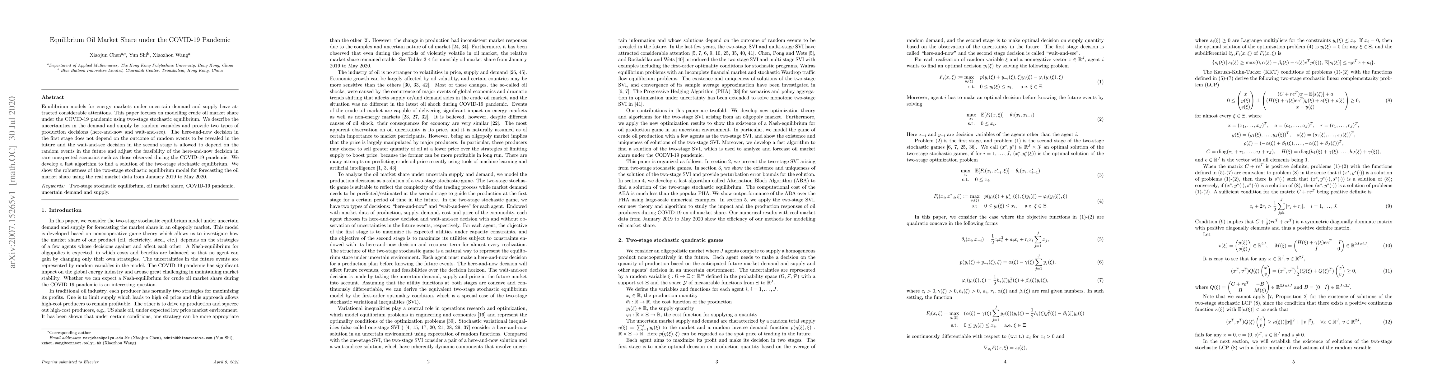 This research paper uses a two-stage stochastic equilibrium model to forecast crude oil market share under the COVID-19 pandemic. It demonstrates the robustness of the model using real market data from 2019-2020.
