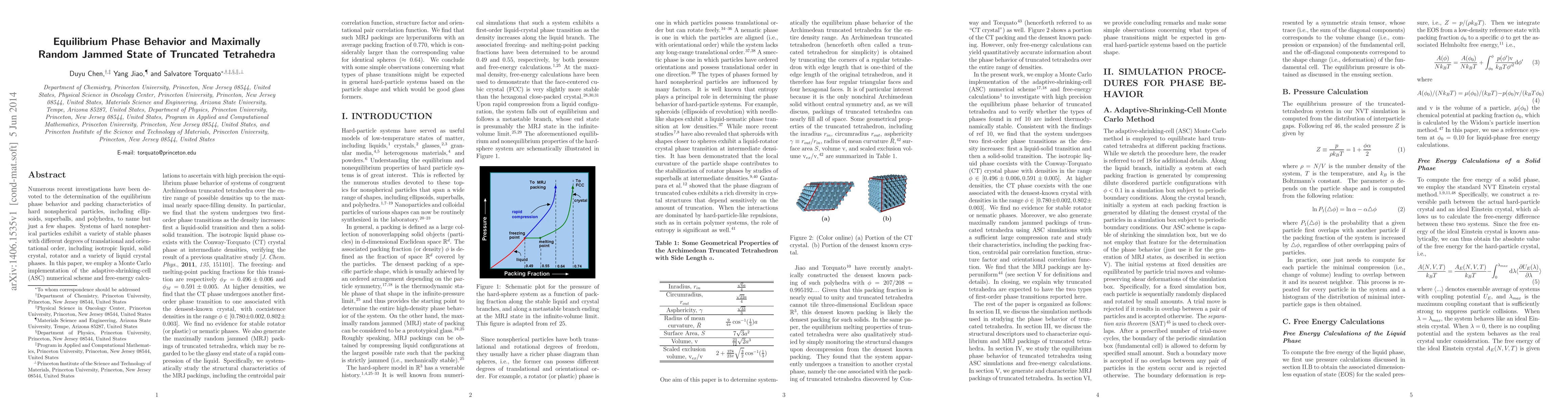 This paper investigates the equilibrium phase behavior of truncated tetrahedra using Monte Carlo simulations and free-energy calculations, revealing two first-order phase transitions: liquid-solid and solid-solid. The study also identifies the maximally random jammed state, showing a higher packing fraction of 0.770 compared to spheres, and discusses potential phase transitions in general hard-particle systems.