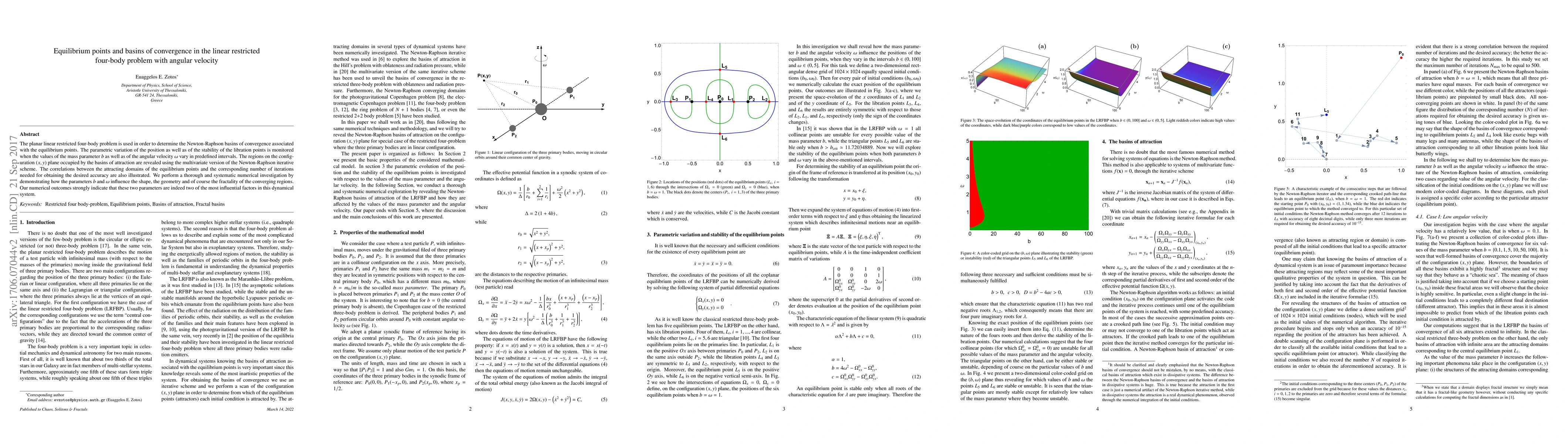 This paper investigates the equilibrium points and convergence basins in the planar linear restricted four-body problem, focusing on the effects of varying mass parameter $b$ and angular velocity $\omega$. The study reveals the intricate geometry and fractal nature of the basins of attraction influenced by these parameters.
