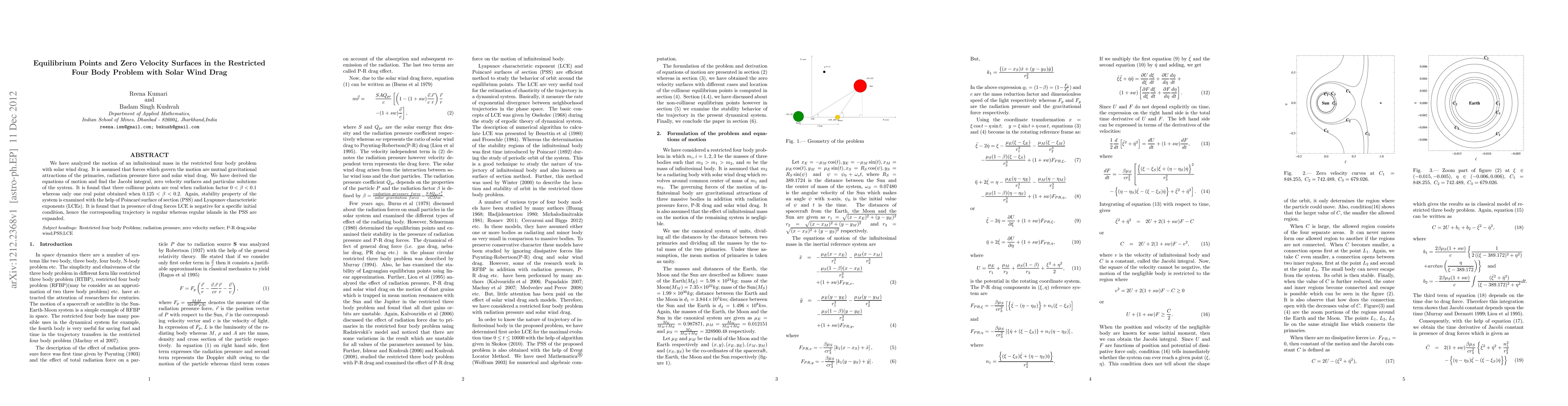 We have analyzed the motion of an infinitesimal mass in the restricted four body problem with solar wind drag. It is assumed that forces which govern the motion are mutual gravitational attractions of the primaries, radiation pressure force and solar wind drag. We have derived the equations of motion and find the Jacobi integral, zero velocity surfaces and particular solutions of the system. It is found that three collinear points are real when radiation factor $0<\beta<0.1$ whereas only one real point obtained when $0.125<\beta<0.2$. Again, stability property of the system is examined with the help of Poincar\'{e} surface of section (PSS) and Lyapunov characteristic exponents (LCEs). It is found that in presence of drag forces LCE is negative for a specific initial condition, hence the corresponding trajectory is regular whereas regular islands in the PSS are expanded.