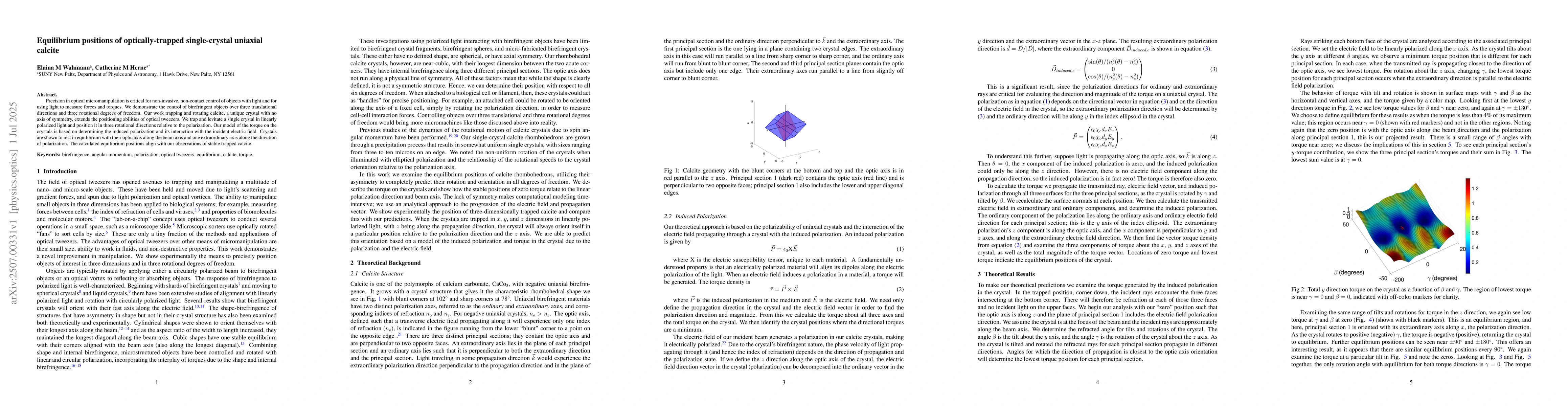 Precision in optical micromanipulation is critical for non-invasive, non-contact control of objects with light and for using light to measure forces and torques. We demonstrate the control of birefringent objects over three translational directions and three rotational degrees of freedom. Our work trapping and rotating calcite, a unique crystal with no axis of symmetry, extends the positioning abilities of optical tweezers. We trap and levitate a single crystal in linearly polarized light and position it in three rotational directions relative to the polarization. Our model of the torque on the crystals is based on determining the induced polarization and its interaction with the incident electric field. Crystals are shown to rest in equilibrium with their optic axis along the beam axis and one extraordinary axis along the direction of polarization. The calculated equilibrium positions align with our observations of stable trapped calcite.