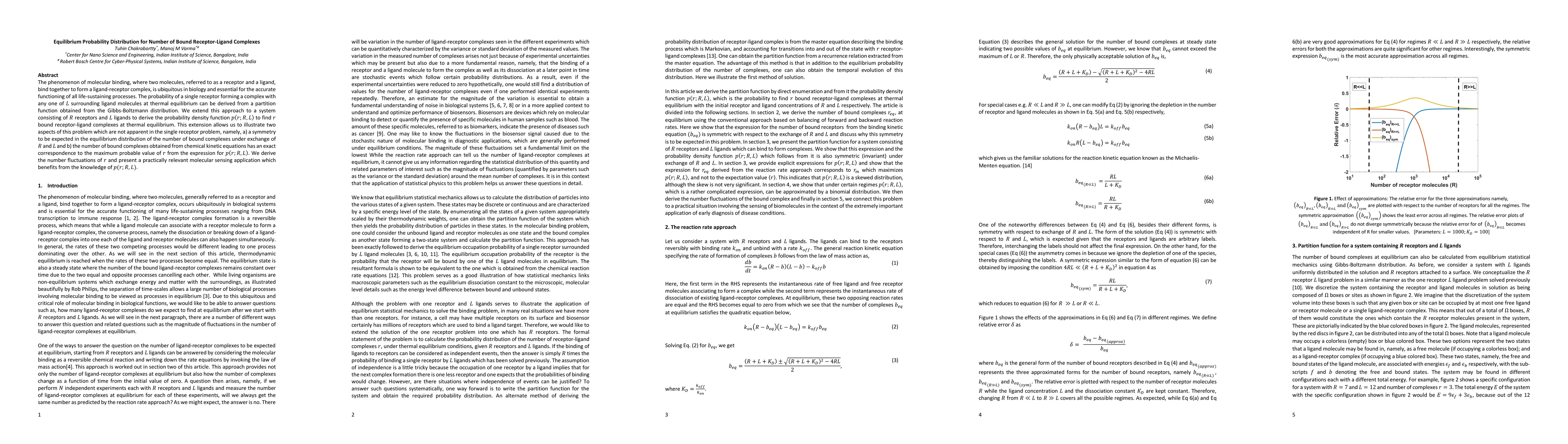 The phenomenon of molecular binding, where two molecules, referred to as a receptor and a ligand, bind together to form a ligand-receptor complex, is ubiquitous in biology and essential for the accurate functioning of all life-sustaining processes. The probability of a single receptor forming a complex with any one of L surrounding ligand molecules at thermal equilibrium can be derived from a partition function obtained from the Gibbs-Boltzmann distribution. We extend this approach to a system consisting of R receptors and L ligands to derive the probability density function p(r;R,L) to find r bound receptor-ligand complexes at thermal equilibrium. This extension allows us to illustrate two aspects of this problem which are not apparent in the single receptor problem, namely, a) a symmetry to be expected in the equilibrium distribution of the number of bound complexes under exchange of R and L and b) the number of bound complexes obtained from chemical kinetic equations has an exact correspondence to the maximum probable value of r from the expression for p(r;R,L). We derive the number fluctuations of r and present a practically relevant molecular sensing application that benefits from the knowledge of p(r;R,L).