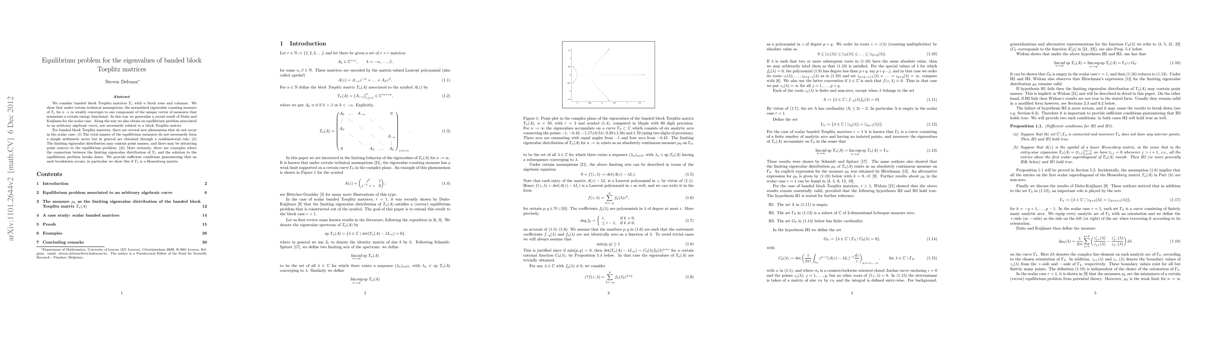 This paper studies the eigenvalue distribution of banded block Toeplitz matrices, proving that their normalized eigenvalue counting measure converges to an equilibrium measure minimizing a specific energy functional. It generalizes previous results for scalar cases and identifies new phenomena in the block matrix context, including complex mass distributions and potential breakdowns in the connection between eigenvalue distribution and equilibrium problems.