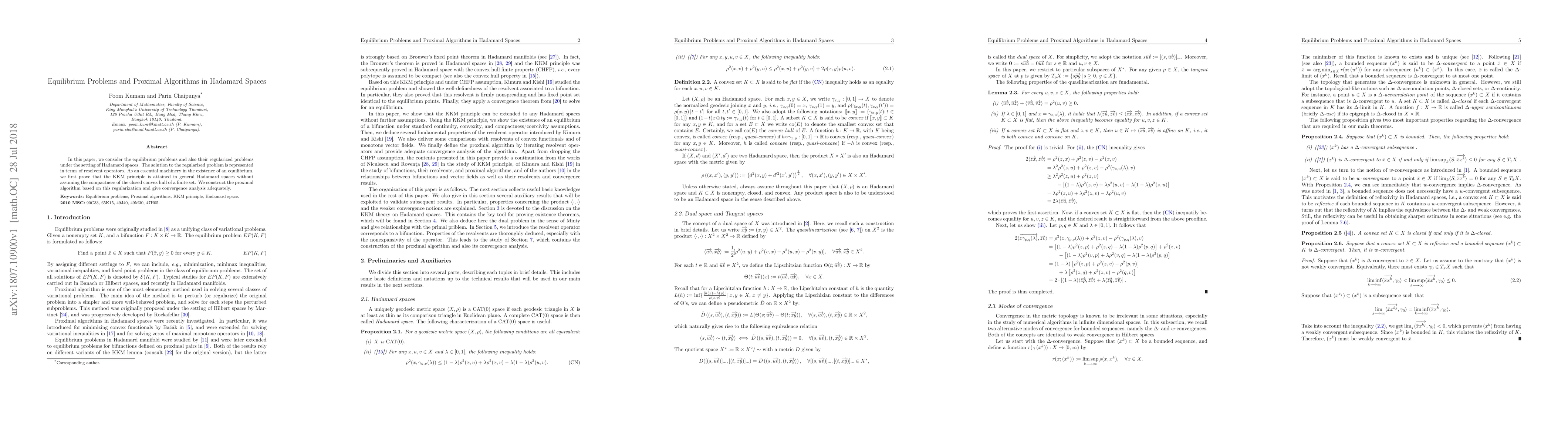 The paper establishes the KKM principle in Hadamard spaces, develops a proximal algorithm, and proves properties of the resolvent operator for bifunctions, contributing to the theoretical framework of equilibrium problems and variational inequalities in non-smooth geometric settings.