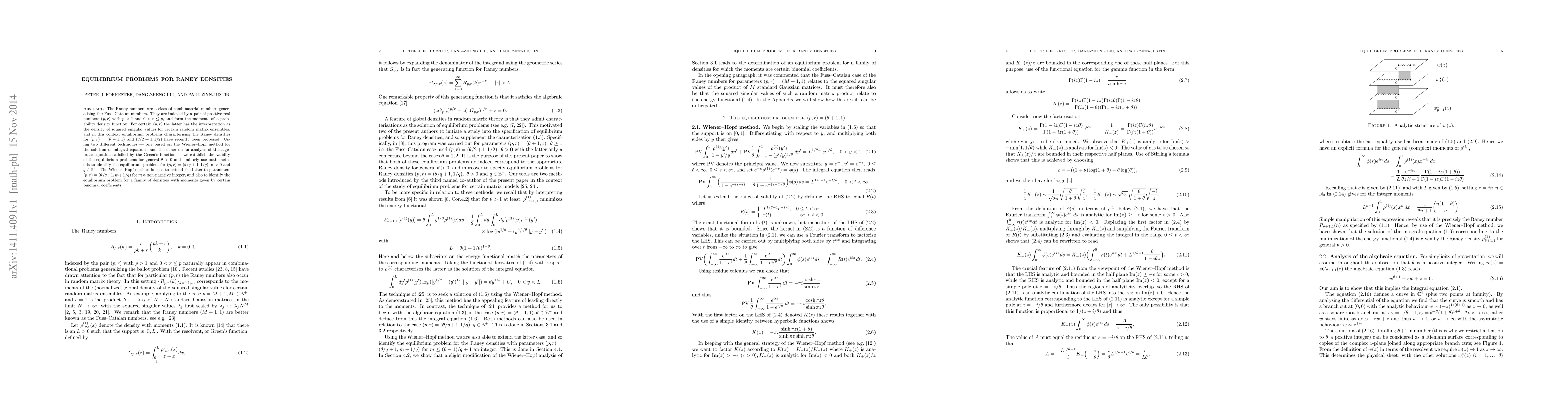 The Raney numbers are a class of combinatorial numbers generalising the Fuss--Catalan numbers. They are indexed by a pair of positive real numbers $(p,r)$ with $p>1$ and $0 < r \le p$, and form the moments of a probability density function. For certain $(p,r)$ the latter has the interpretation as the density of squared singular values for certain random matrix ensembles, and in this context equilibrium problems characterising the Raney densities for $(p,r) = (\theta +1,1)$ and $(\theta/2+1,1/2)$ have recently been proposed. Using two different techniques --- one based on the Wiener--Hopf method for the solution of integral equations and the other on an analysis of the algebraic equation satisfied by the Green's function --- we establish the validity of the equilibrium problems for general $\theta > 0$ and similarly use both methods to identify the equilibrium problem for $(p,r) = (\theta/q+1,1/q)$, $\theta > 0$ and $q \in \mathbb Z^+$. The Wiener--Hopf method is used to extend the latter to parameters $(p,r) = (\theta/q + 1, m+ 1/q)$ for $m$ a non-negative integer, and also to identify the equilibrium problem for a family of densities with moments given by certain binomial coefficients.