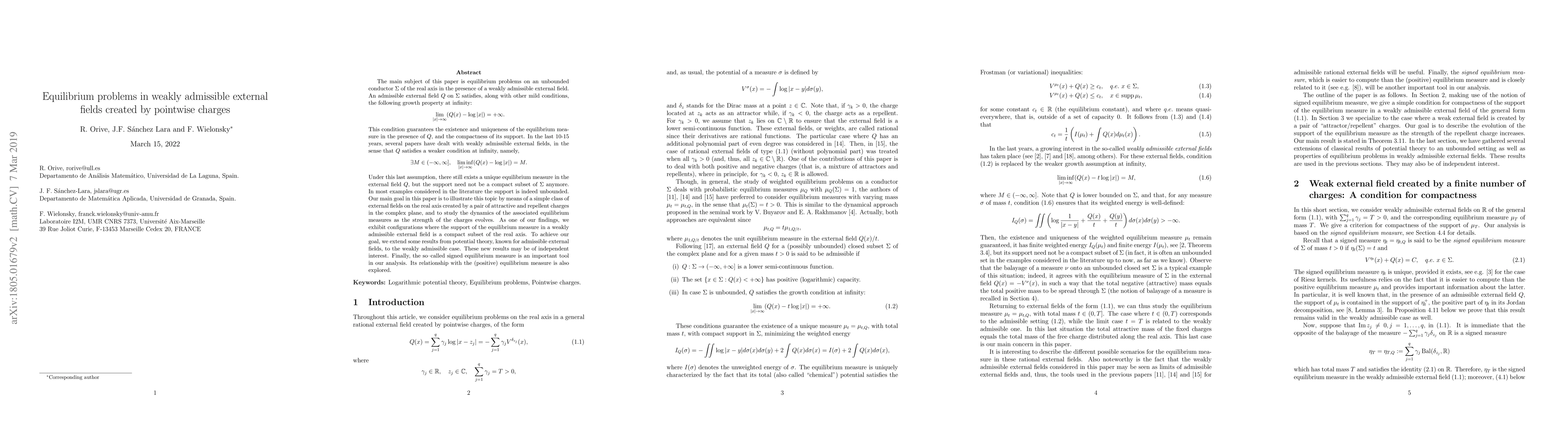 The main subject of this paper is equilibrium problems on an unbounded conductor $\Sigma$ of the complex plane in the presence of a weakly admissible external field. An admissible external field $Q$ on $\Sigma$ satisfies, along with other mild conditions, the following growth property at infinity: $$\lim_{|x| \rightarrow \infty}(Q(x) - \log |x|) = +\infty.$$ This condition guarantees the existence and uniqueness of the equilibrium measure in the presence of $Q$, and the compactness of its support. In the last 10-15 years, several papers have dealt with weakly admissible external fields, in the sense that $Q$ satisfies a weaker condition at infinity, namely, $$\exists M\in(-\infty,\infty],\quad\liminf_{|x| \rightarrow \infty}(Q(x) - \log |x|) = M.$$ Under this last assumption, there still exists a unique equilibrium measure in the external field $Q$, but the support need not be a compact subset of $\Sigma$ anymore. In most examples considered in the literature the support is indeed unbounded. Our main goal in this paper is to illustrate this topic by means of a simple class of external fields on the real axis created by a pair of attractive and repellent charges in the complex plane, and to study the dynamics of the associated equilibrium measures as the strength of the charges evolves. As one of our findings, we exhibit configurations where the support of the equilibrium measure in a weakly admissible external field is a compact subset of the real axis. To achieve our goal, we extend some results from potential theory, known for admissible external fields, to the weakly admissible case. These new results may be of independent interest. Finally, the so--called signed equilibrium measure is an important tool in our analysis. Its relationship with the (positive) equilibrium measure is also explored.