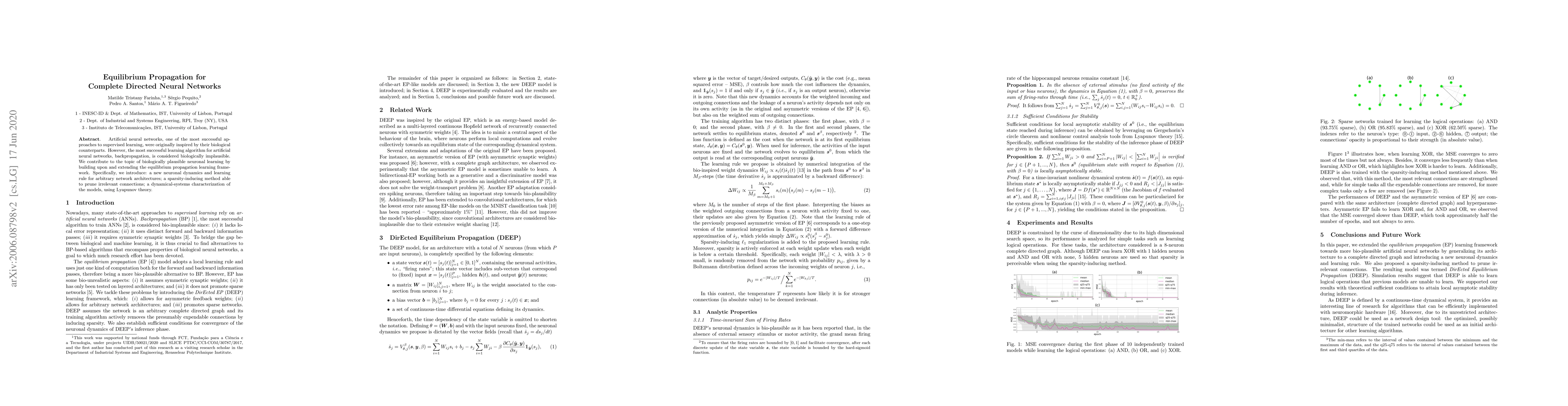 This paper introduces a biologically plausible learning framework called equilibrium propagation for complete directed neural networks, featuring a new neuronal dynamics and learning rule, a sparsity-inducing method for pruning, and a dynamical-systems analysis using Lyapunov theory.