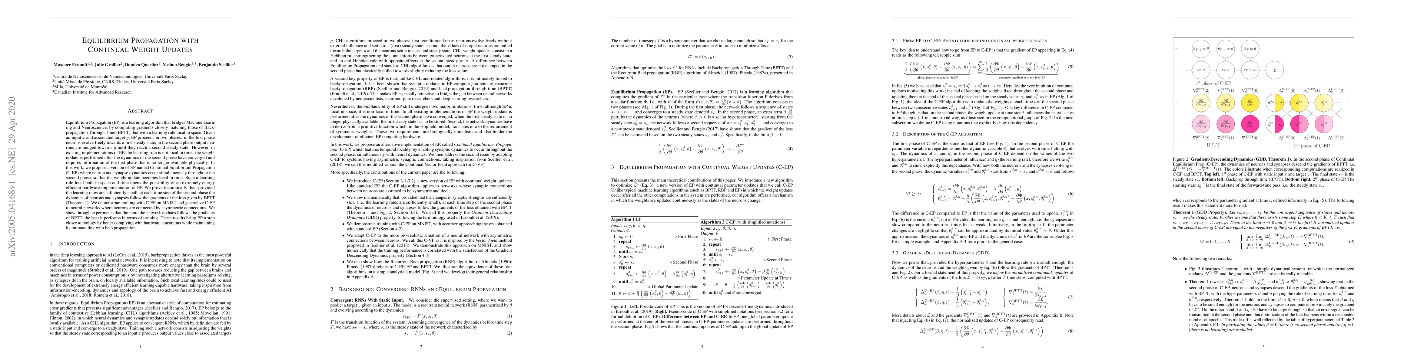 This paper proposes Continual Equilibrium Propagation (C-EP), a variant of Equilibrium Propagation that updates weights locally in time during the learning process, enhancing energy efficiency. Theoretical proofs and empirical results on MNIST demonstrate that the proposed method aligns neuron and synapse dynamics with Backpropagation Through Time gradients, improving performance.