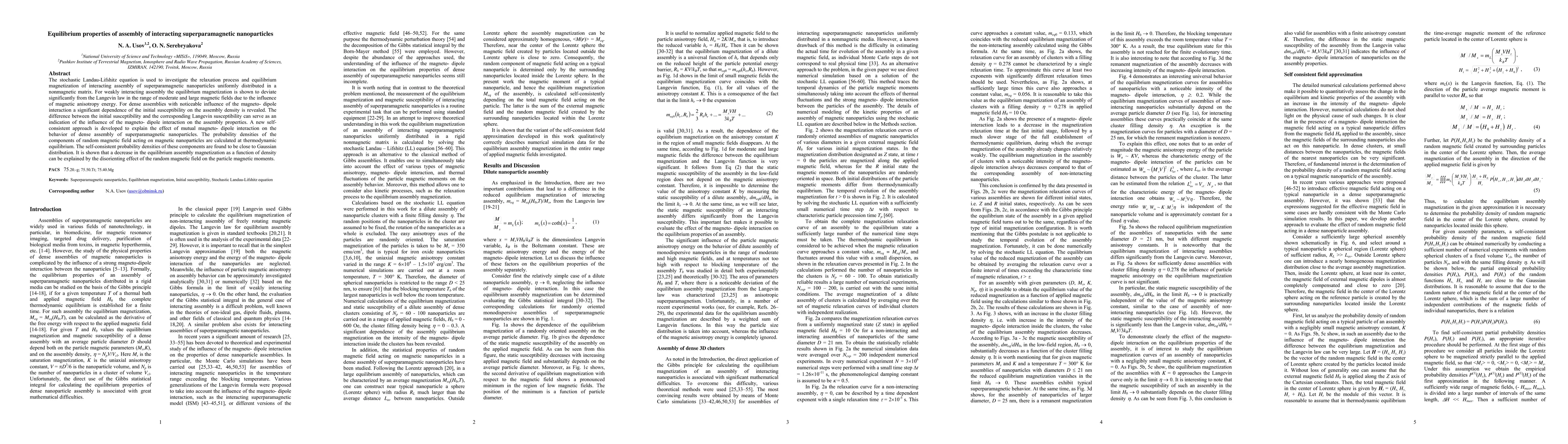 This paper investigates the relaxation process and equilibrium magnetization of superparamagnetic nanoparticles using the stochastic Landau-Lifshitz equation, revealing deviations from the Langevin law in weakly interacting assemblies due to magnetic anisotropy. A new self-consistent approach explains the mutual magneto-dipole interaction effects in dense assemblies, showing a decrease in equilibrium magnetization due to the disorienting effect of a random magnetic field.